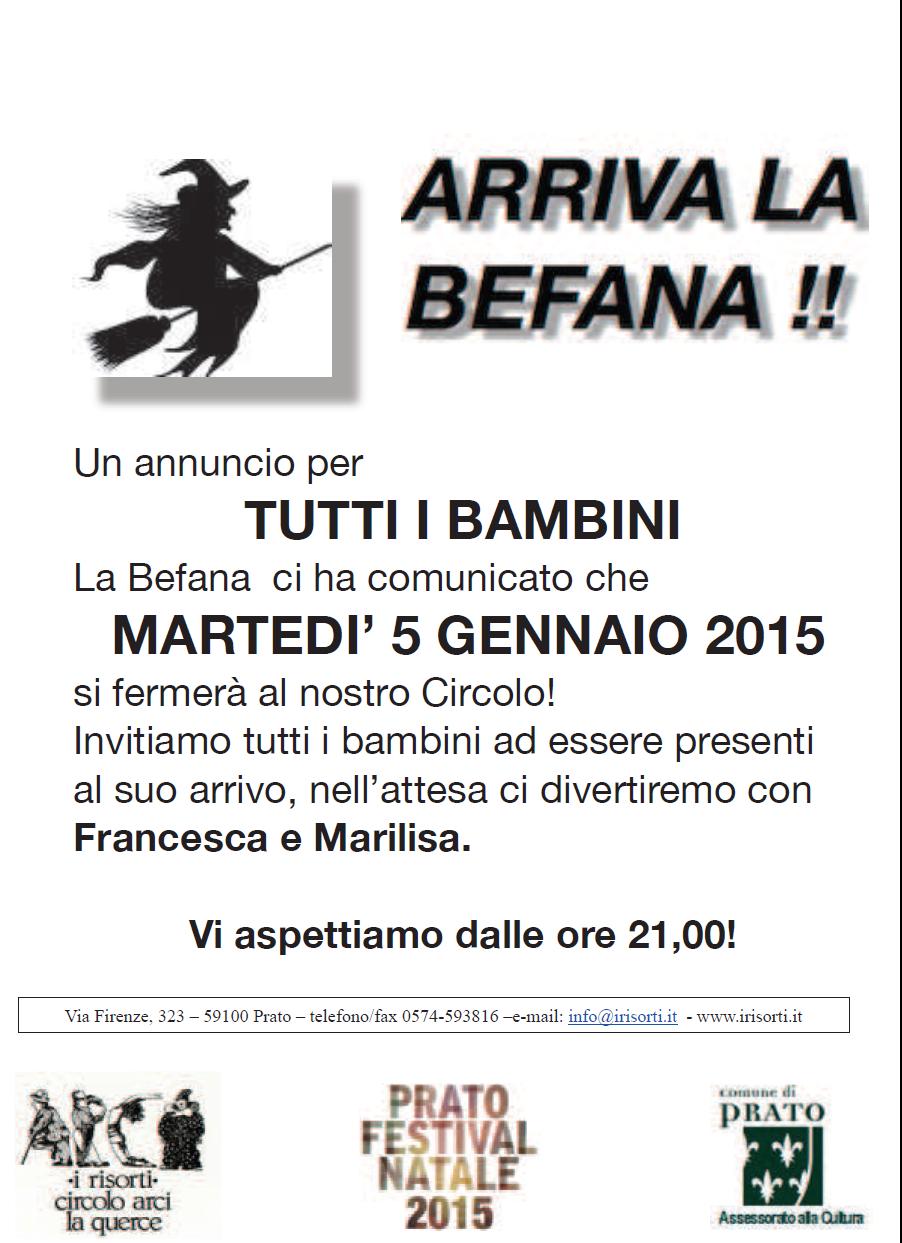 - Al Circolo “I Risorti” (via Firenze, 323 a La Querce), martedì 5 gennaio, alle 21.00, aspettiamo l’arrivo della Befana con l’animazione di Francesca e Marilisa