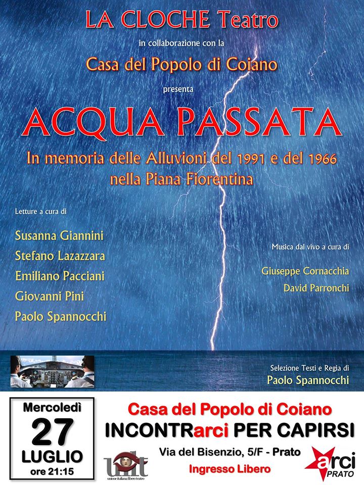 Mercoledì 27 luglio alla Casa del Popolo di Coiano (Via del Bisenzio a San Martino 5/F, Prato), nell’ambito della rassegna “Incontrarci per capirsi. Estate 2016“, la compagnia “La Cloche Teatro” presenta lo spettacolo “Acqua Passata”, letture e musica in memoria delle alluvioni del 1991 e del 1966 nella piana fiorentina. Regia di Paolo Spannocchi. Inizio spettacolo ore 21.15. Ingresso libero