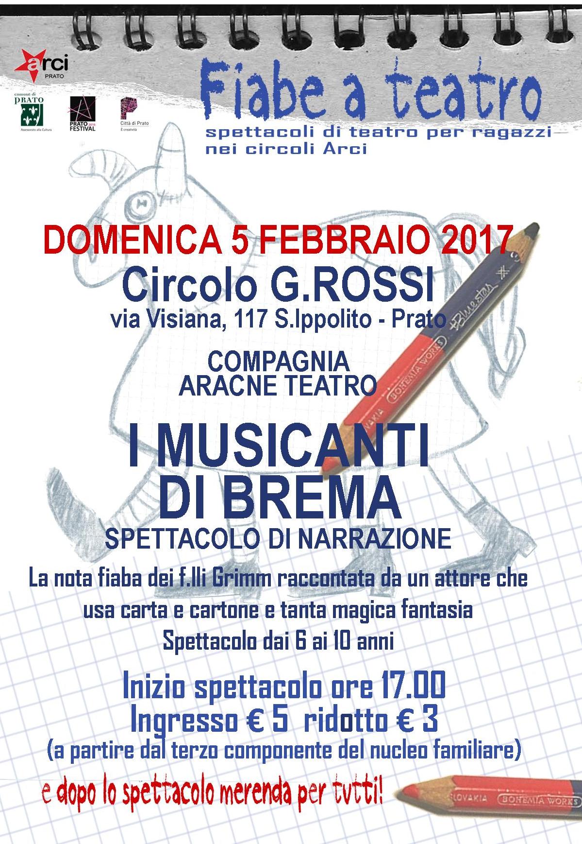 Gli appuntamenti di domenica 5 febbraio con “Fiabe a Teatro”: al Circolo G. Rossi di Sant’Ippolito (Via Visiana, 117, Prato), la compagnia “Aracne Teatro” presenta “I musicanti di Brema” di e con Gionni Voltan; alla Casa del Popolo di Vaiano (via Braga 183, Vaiano), la Compagnia “Teatri d’Imbarco” presenta “La storia incredibile di Lupo e Capra“. Inizio spettacoli ore 17.00, a seguire merenda. Ingresso: spettacolo + merenda 5 €, ridotto 3 € (a partire dal terzo componente del nucleo familiare).