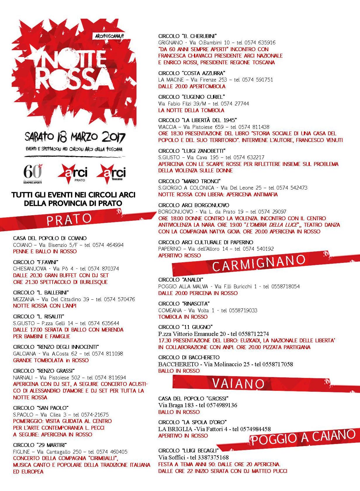 Il programma completo delle iniziative nei Circoli di Prato e dintorni, in occasione della Notte Rossa dei Circoli Arci della Toscana, sabato 18 marzo 2017: cene, spettacoli, ballo, tombola, incontri, e molto altro ancora…