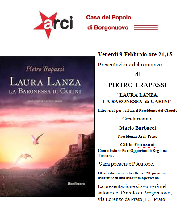 Venerdì 9 febbraio, alle ore 21.15 al Circolo Arci Borgonuovo (via Lorenzo da Prato 17, Prato), incontro con Pietro Trapassi, autore del romanzo “Laura Lanza. La Baronessa di Carini”. Interviene Gilda Fronzoni (Commissione Pari Opportunità Regione Toscana). Modera Mario Barbacci (Arci Prato).