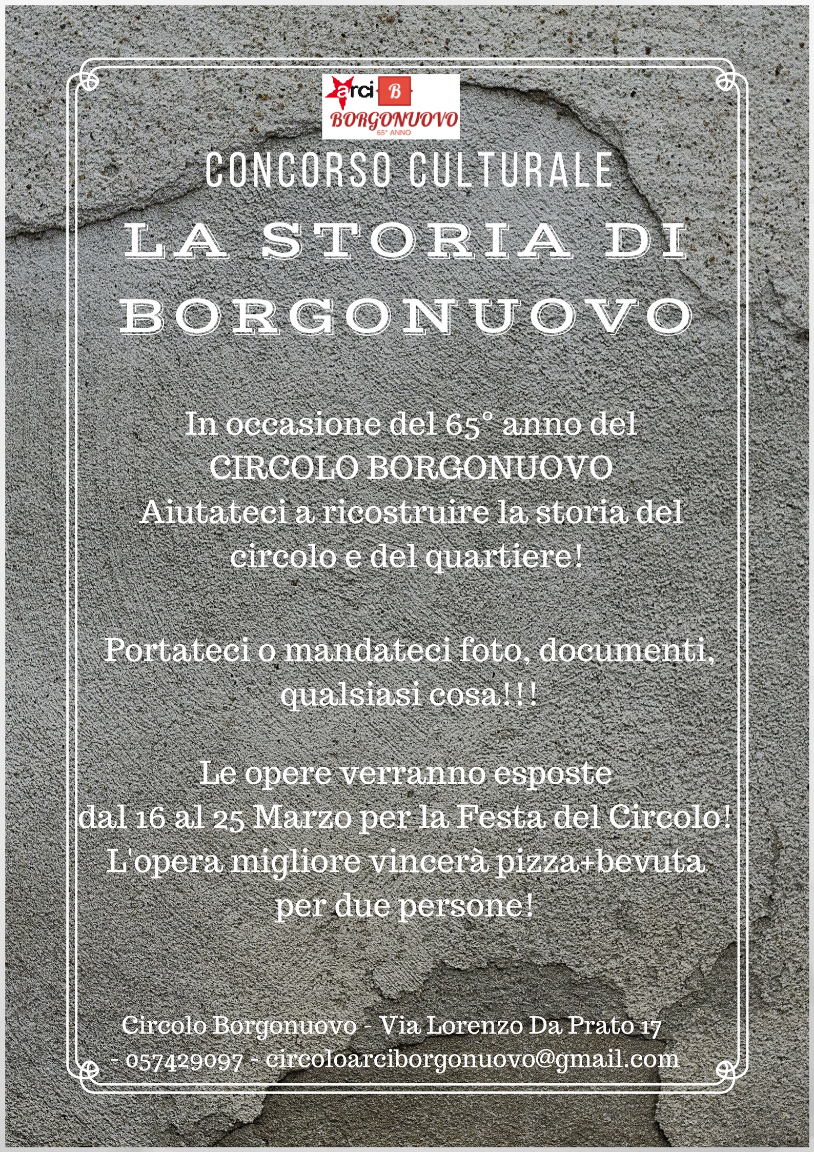 In occasione della festa per i suoi 65 anni, il Circolo Arci Borgonuovo invita tutti coloro che avessero foto, documenti o altri materiali utili a ricostruire la storia del circolo e del quartiere a portarli o inviarli per un’esposizione che si terrà dal 16 al 25 marzo presso il circolo (via Lorenzo da Prato 17, Prato).
