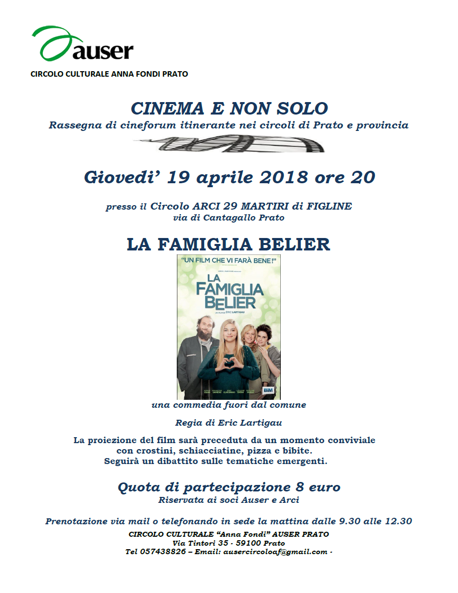 Giovedì 19 aprile, alle ore 20, al Circolo Arci “29 Martiri” a Figline (Via Cantagallo, Prato), per la rassegna “Cinema e non solo”, a cura di Auser Prato / Circolo Culturale “Anna Fondi”, proiezione del film “La Famiglia Belier”, di Eric Lartigau. La proiezione sarà preceduta da un momento conviviale con crostini, schiacciatine, pizza e bibite. Quota di partecipazione 8 € (ingresso riservato soci Auser e Arci). Per info e prenotazioni 0574 38826, ausercircoloaf@gmail.com.