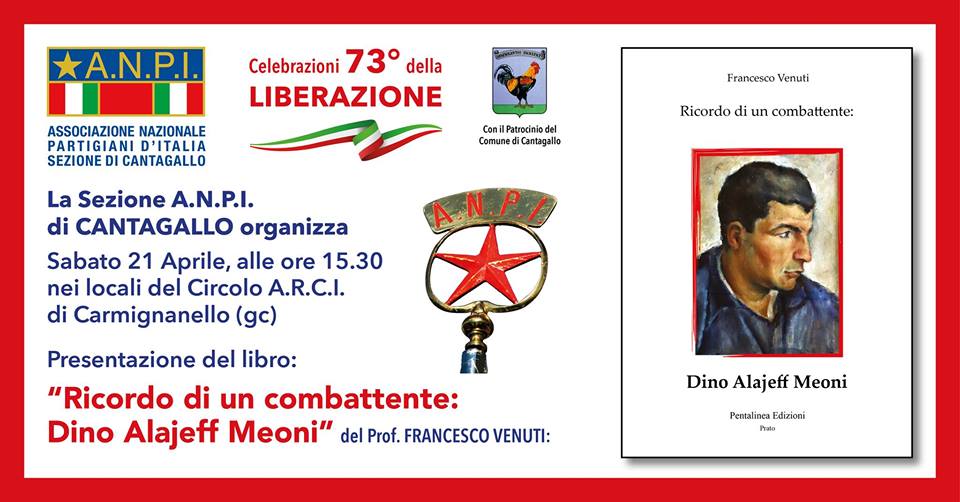 In occasione del 73° anniversario della Liberazione, la Sezione Anpi di Cantagallo e il Circolo Arci di Carmignanello organizzano per sabato 21 aprile alle ore 15.30 presso il Circolo, un incontro con Francesco Venuti per presentare il suo libro “Ricordo di un combattente: Dino Alajeff Meoni”. Con il patrocinio del Comune di Cantagallo.