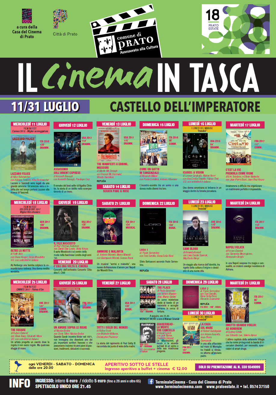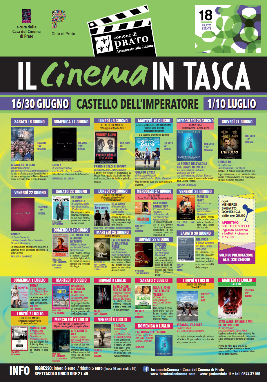 Riapre sabato 16 giugno l’arena cinematografica estiva del Castello dell’Imperatore, che sarà gestita anche quest’anno dalla Casa del Cinema di Prato aggiudicataria della gara promossa dal Comune di Prato per il periodo 2018/2022. Il programma, che fa parte della Prato Estate 2018, prevede più di 80 serate di proiezione con i migliori titoli della stagione 2017/2018 e alcune importanti novità.