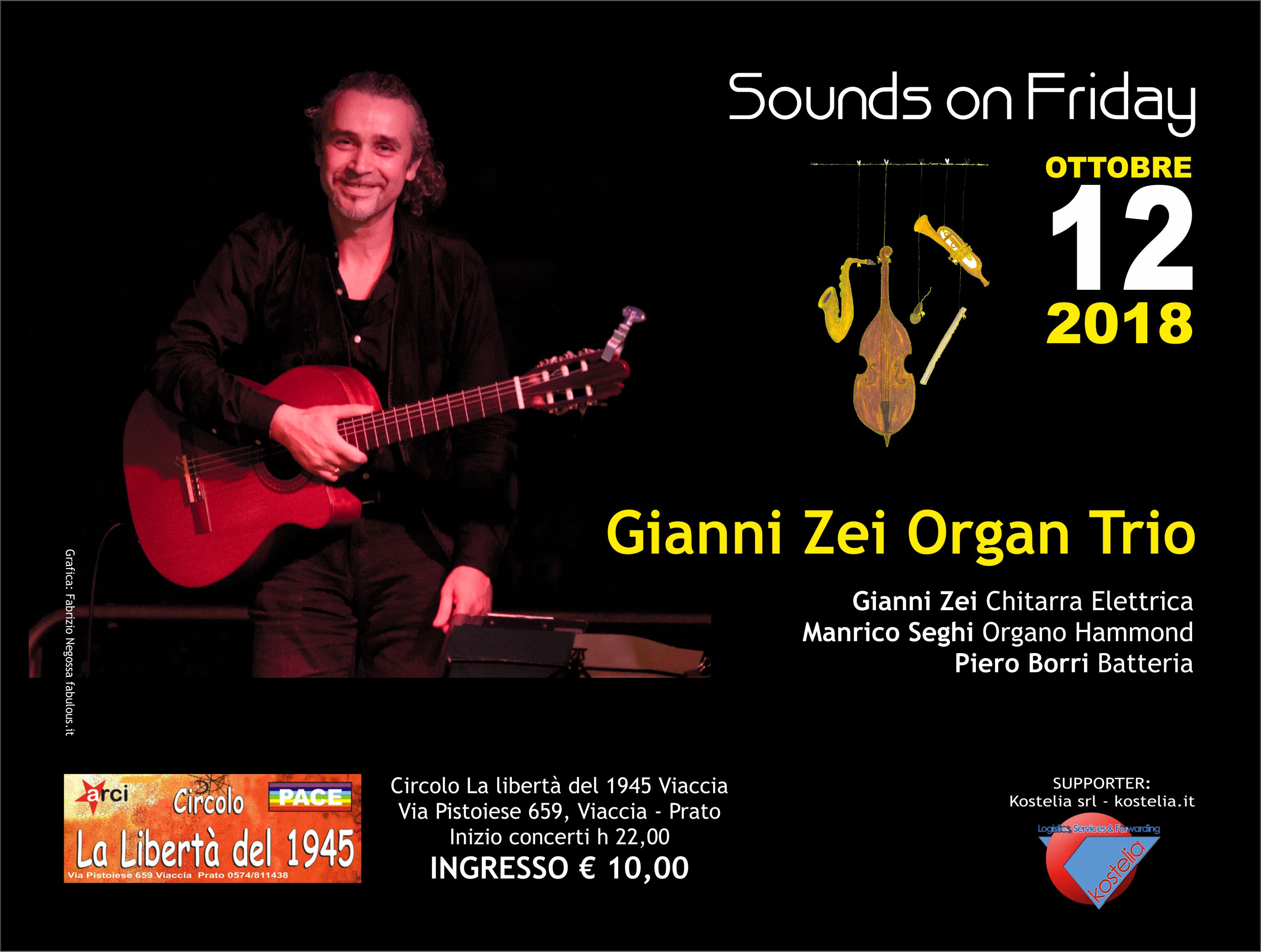 Venerdì 12 ottobre al Circolo Arci “La Libertà del 1945” a Viaccia (via Pistoiese 659, Prato) secondo appuntamento con la rassegna musicale “Sounds on Friday – Autunno 2018“. Sul palco il Gianni Zei Organ Trio (Gianni Zei chitarra elettrica Manrico Seghi organo hammond Piero Borri batteria). Inizio concerto ore 22.00, ingresso 10,00 €.