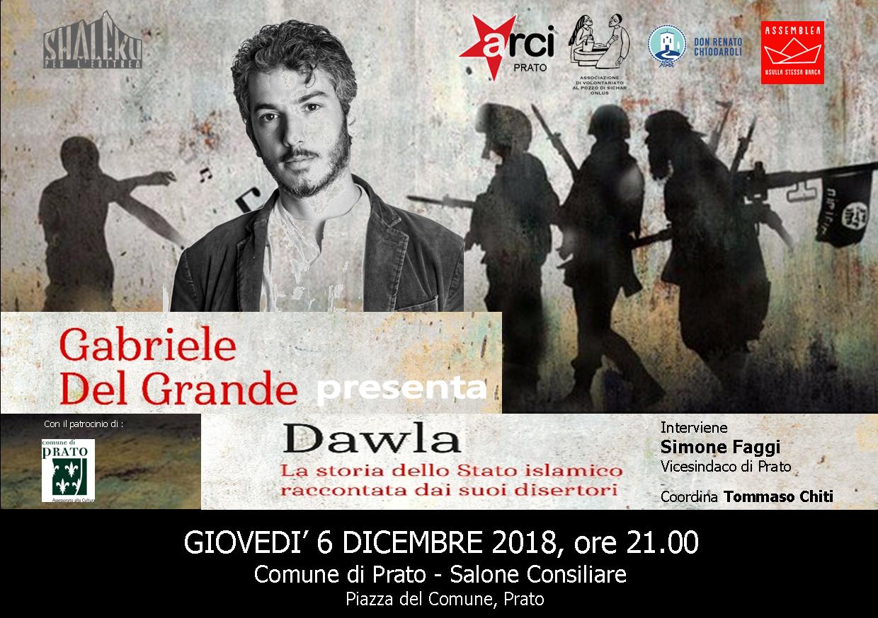 Dawla in arabo significa “Stato” ed è uno dei modi in cui gli affiliati dello Stato islamico chiamano la propria organizzazione. Gabriele Del Grande è andato a incontrarli in un avventuroso viaggio partito nel Kurdistan iracheno e terminato con il suo arresto in Turchia nella primavera del 2017. Ne è nato un libro che racconta le loro storie, intrecciate alla storia più grande dell’ascesa e della caduta dello Stato islamico. Senza mai cedere ai toni della saggistica, Del Grande mette in scena una galleria di personaggi le cui vicende si snodano in un intreccio di storytelling e geopolitica. Il libro è stato realizzato grazie a un crowdfunding, al quale ha partecipato anche l’associazione pratese “Shaleku”, da sempre sostenitrice del lavoro di Del Grande e organizzatrice della serata, in collaborazione con Arci Prato, Il Pozzo di Sichar, associazione Don Renato Chiodaroli, “Assemblea Sulla stessa barca”, e con il patrocinio del Comune di Prato.