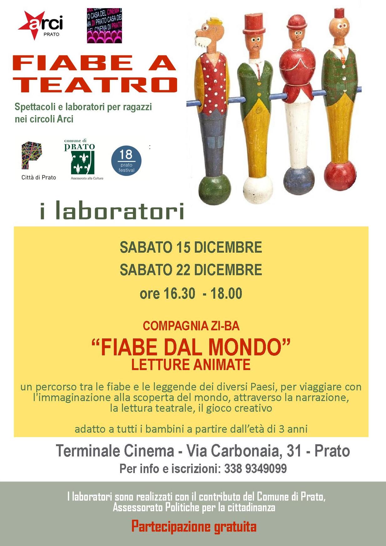 Sono aperte le iscrizioni per i laboratori per bambini di sabato 15 e sabato 22 dicembre, alle 16.30, al Terminale Cinema, Saletta Anna Magnani: due incontri del Ciclo di letture animate condotte dalla Compagnia Ziba. Un percorso tra le fiabe e le leggende dei diversi Paesi, per viaggiare con l’immaginazione alla scoperta del mondo, attraverso la narrazione, la lettura teatrale, il gioco creativo. Durata degli incontri 16.30 – 18.00. Adatti a tuttti i bambini a partire dall’età di 3 anni. Ingresso libero. I laboratori sono realizzati con il contributo del Comune di Prato, Assessorato alle Politiche per la Cittadinanza.