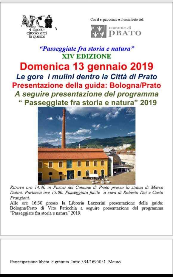 Il gruppo “Passeggiate tra Storia e Natura” del Circolo “I Risorti” propone per domenica 13 gennaio un itinerario tra le gore e i mulini della citta di Prato e, a seguire, alle ore 16.30 presso la Biblioteca Lazzerini, presentazione della guida “Via della Lana e della Seta. A piedi da Bologna a Prato” di Vito Paticchia, e presentazione del programma 2019 delle “Passeggiate tra storia e natura”.