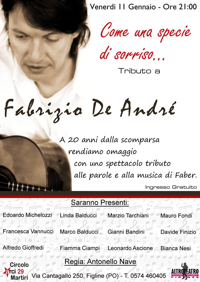 Venerdì 11 gennaio, alle ore 21:00, al Circolo Arci “29 Martiri” a Figline (Via Cantagallo 250, Prato), spettacolo di parole e musica per ricordare Fabrizio De Andre’ a 20 anni dalla sua scomparsa. Regia di Antonello Nave. In collaborazione con AltroTeatro. Ingresso libero.
