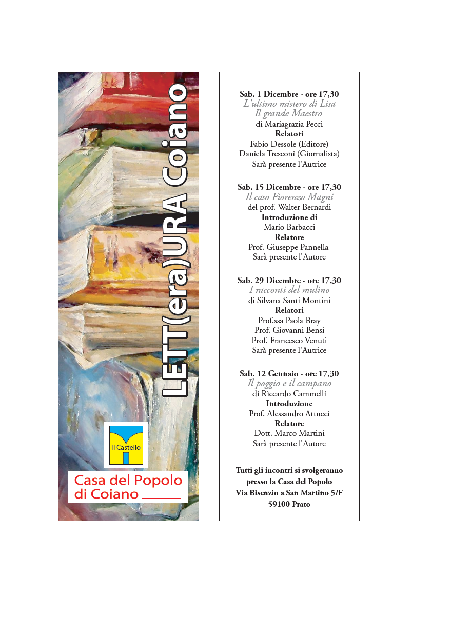 Il programma di dicembre 2018 e gennaio 2019 del nuovo Circolo di lettura della Casa del Popolo di Coiano: 4 appuntamenti con libri e autori in collaborazione con l’associazione “Il Castello”. Ingresso libero