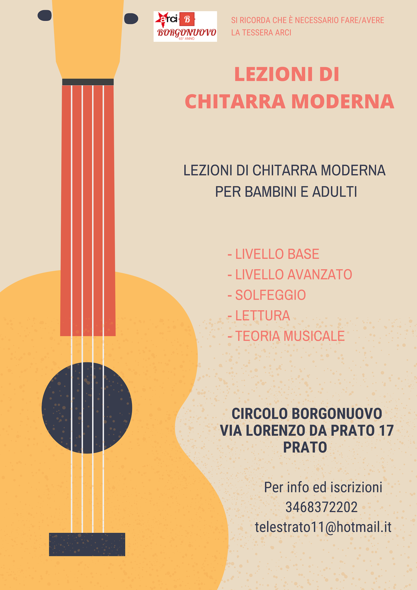 Al Circolo Arci Borgonuovo (via Lorenzo da Prato 17, Prato) sono aperte le iscrizioni per le lezioni di chitarra per adulti e bambini a tutti i livelli, a cura di Filippo Toccafondi. Per info e iscrizioni tel. 346 8372202, email telestrato11@hotmail.it