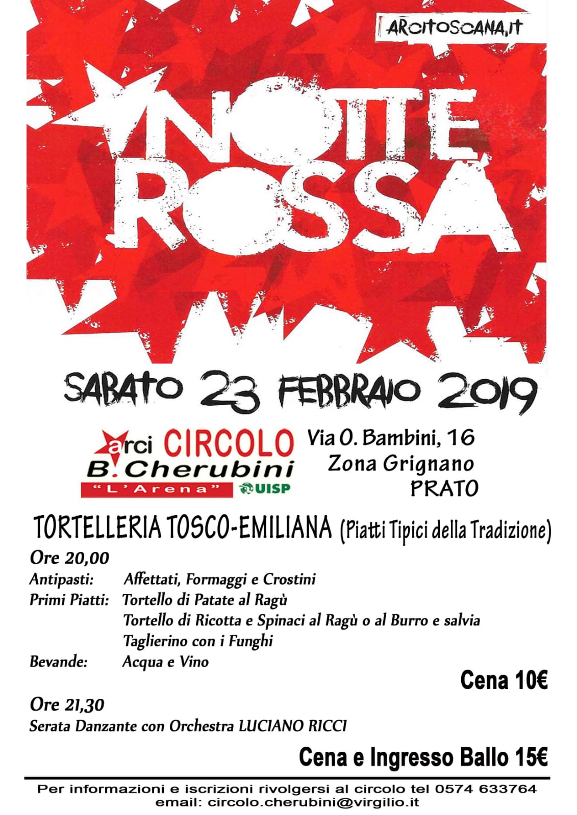 Sabato 23 febbraio, in occasione della Notte Rossa dei Circoli Arci della Toscana, al Circolo Arci B. Cherubini a Grignano (via O. Bambini 16, Prato), dalle 20:00 Tortelleria Tosco-Emiliana, cena con piatti tipici della tradizione, ore 21:30 serata danzante con orchestra Luciano Ricci. Per info e prenotazioni 0574 633764