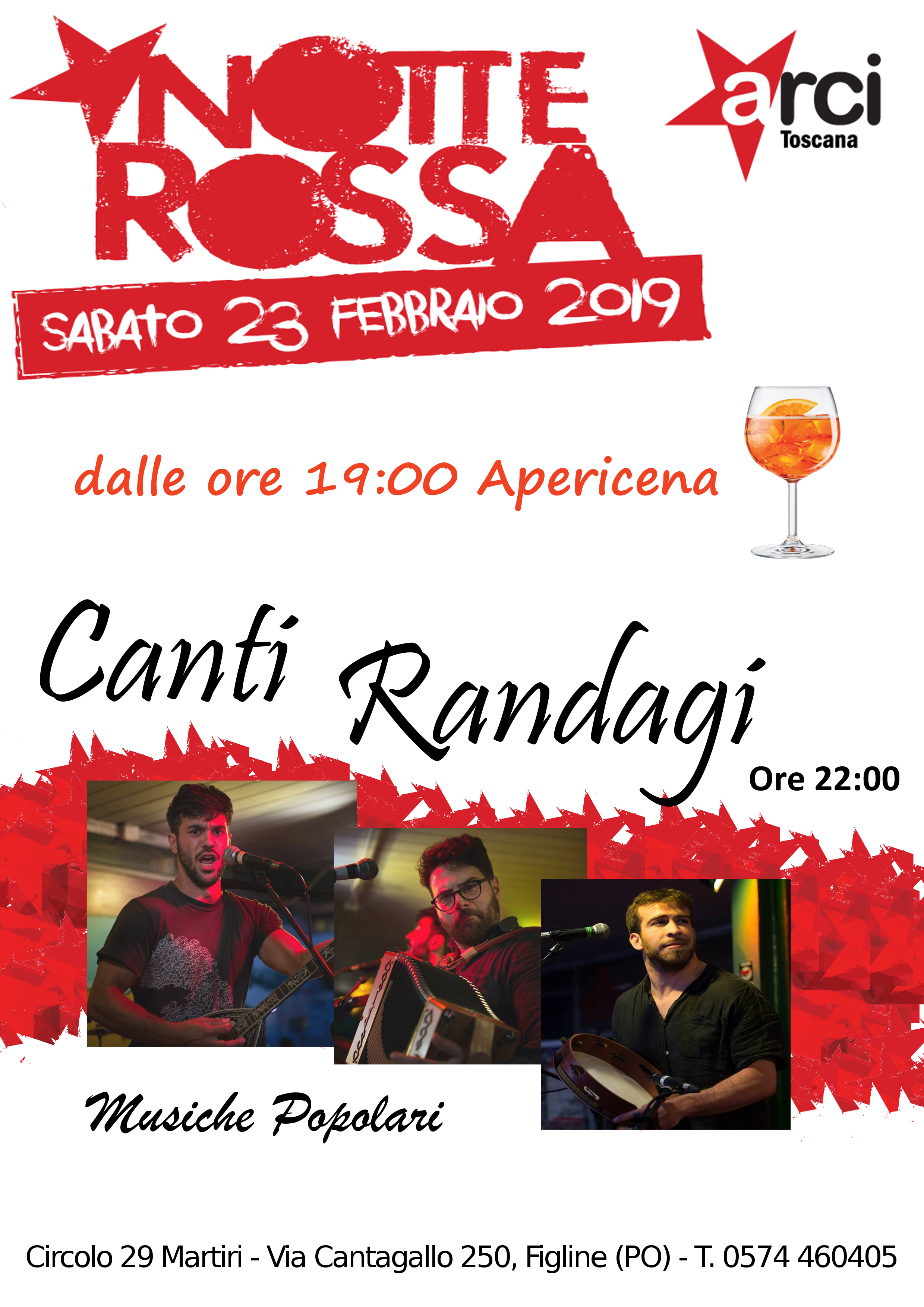 Sabato 23 febbraio, in occasione della Notte Rossa dei Circoli Arci della Toscana, al Circolo “29 Martiri” a Figline (via Cantagallo 250, Prato) dalle 19.00 apericena e dalle 22.00 “Canti Randagi”, concerto di musica popolare. Per info e prenotazioni 0574 460405