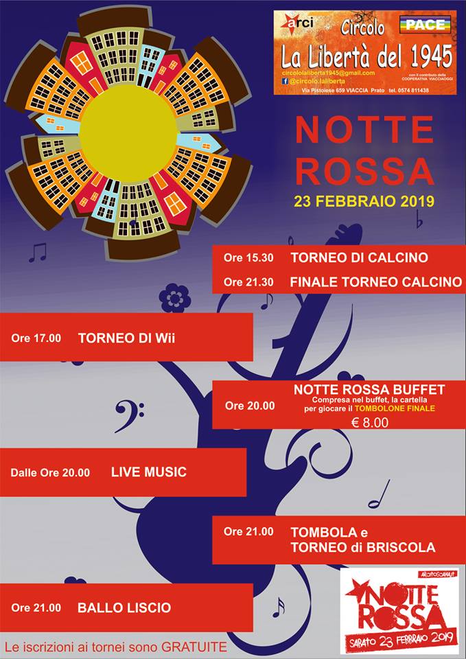 Sabato 23 febbraio, in occasione della Notte Rossa dei Circoli Arci della Toscana, al Circolo “La Libertà del 1945” a Viaccia (via Pistoiese 659, Prato), tornei di calcino e wii, buffet, tombolone e live music.