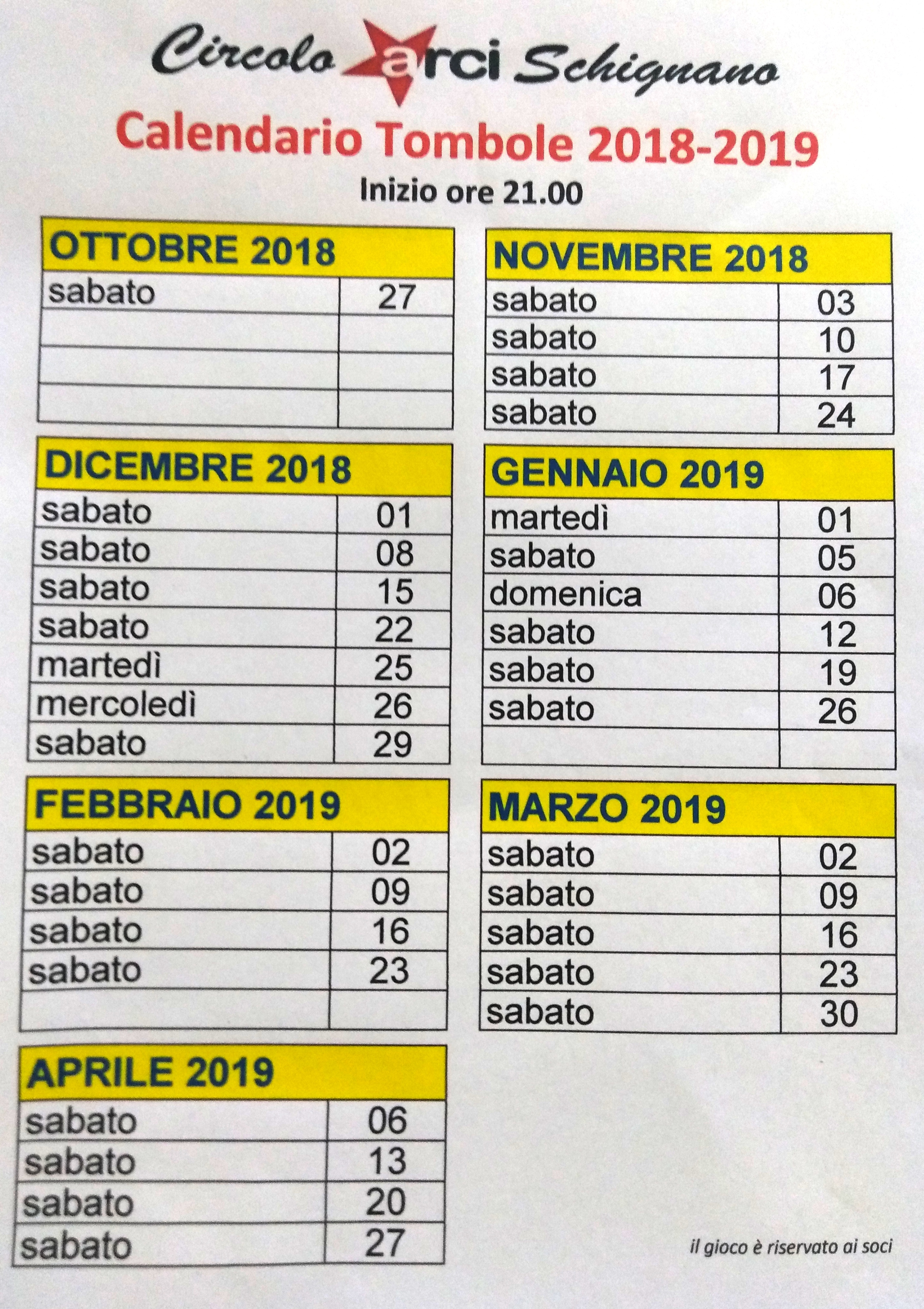 Al Circolo Arci di Schignano (Via Cintelli 14, Schignano), si gioca a tombola tutti i sabati di marzo e aprile 2019, con inizio alle ore 21.00.