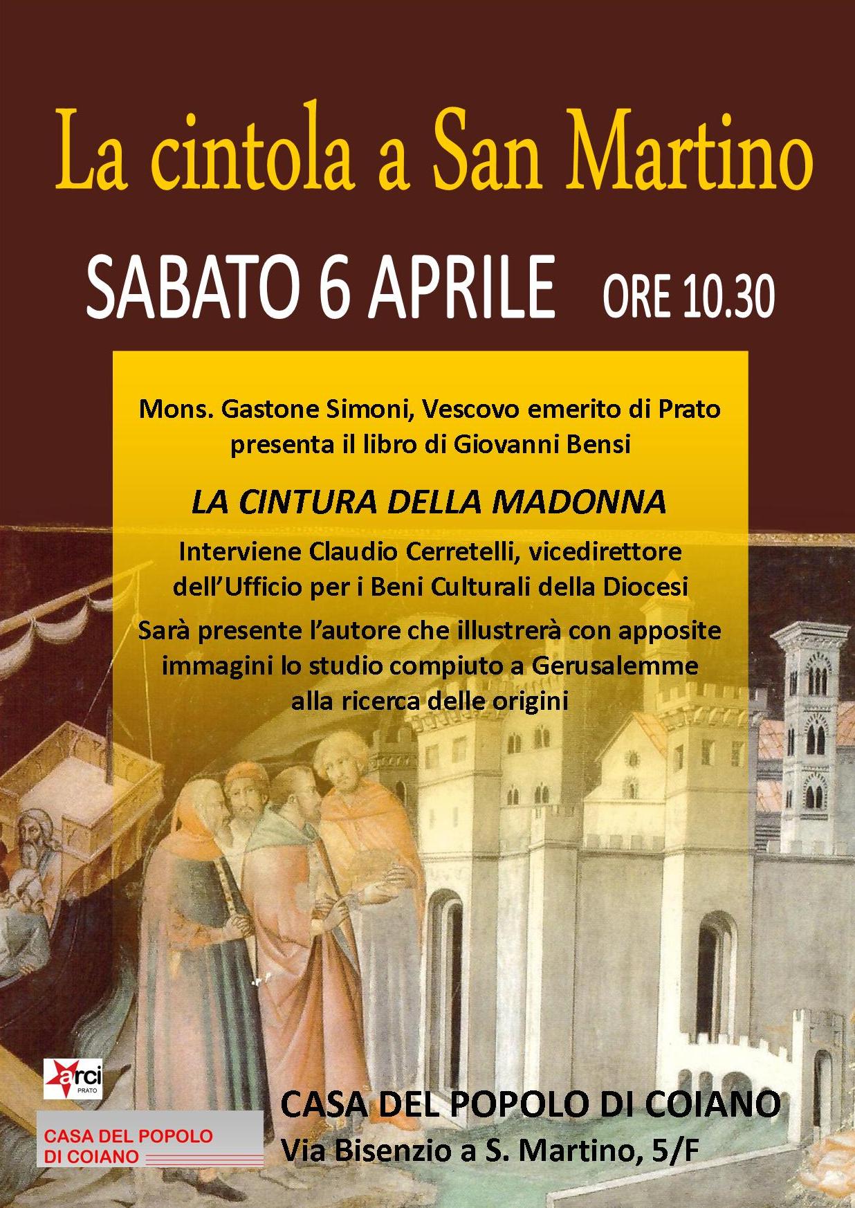 Sabato 6 aprile alle ore 10.30, alla Casa del Popolo di Coiano (via del Bisenzio a S. Martino 5/F), Mons. Gastone Simoni, Vescovo emerito di Prato, presenta il libro di Giovanni Bensi “La Cintura della Madonna”. Interviene Claudio Cerretelli, Vicedirettore dell’Ufficio per i Beni culturali della Diocesi. Sarà presente l’autore che illustrerà lo studio compiuto a Gerusalemme alla ricerca delle origini. Ingresso libero.