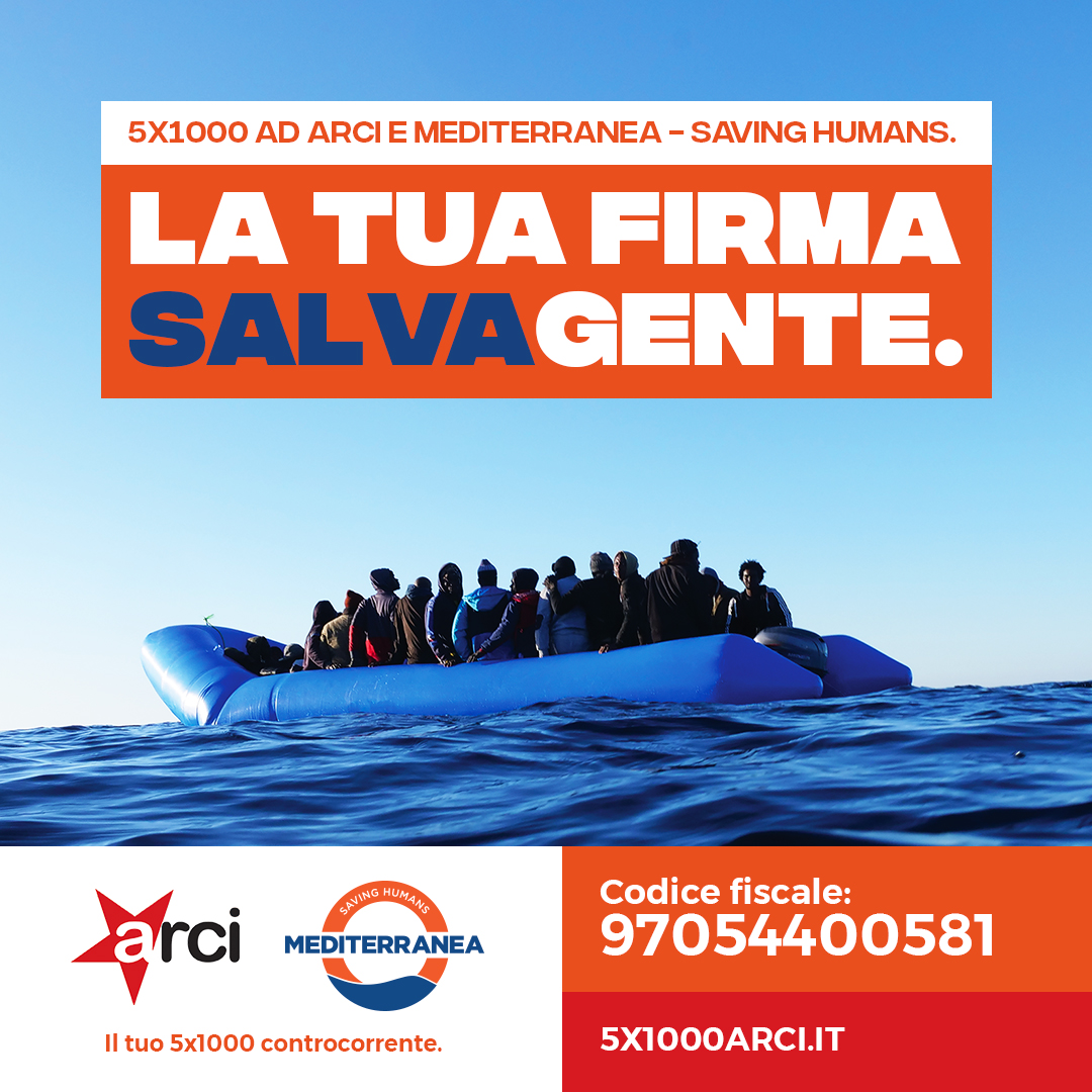 L’Arci ha deciso di destinare la raccolta del 5×1000 di quest’anno a Mediterranea, un progetto che racconta e denuncia la disumanità che deriva dalla criminalizzazione delle ong e dalla politica di chiusura dei porti. Dai il tuo 5×1000 a un progetto importante e concreto che dà a tutti e tutte noi la possibilità di restare autenticamente umani!