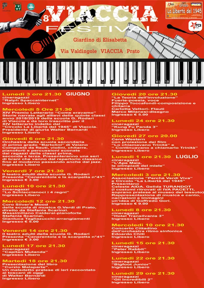 Da lunedì 3 giugno torna la Prato Estate a Viaccia: al Giardino di Elisabetta (ex lavatoi, via Valdingole, Prato), il “Viaccia Festival” propone fino al 29 luglio tanti appuntamenti con il teatro, la musica, i libri, fil cinema per ragazzi… Il programma completo …