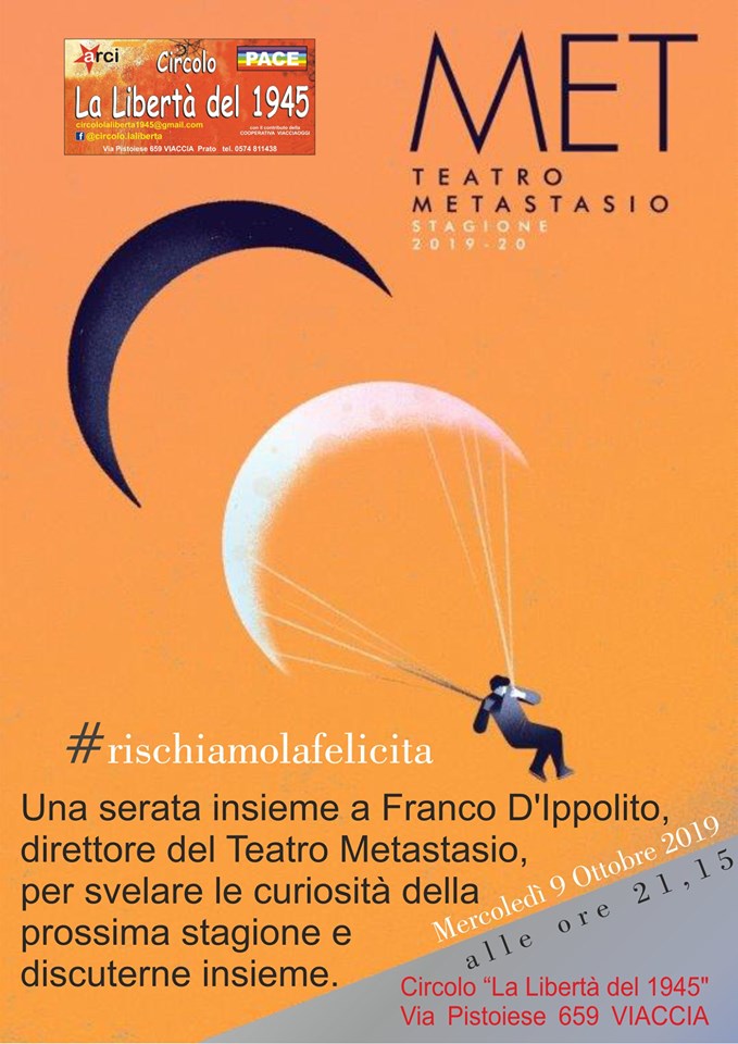 Mercoledì 9 ottobre, alle ore 21.15. al Circolo Arci “La Libertà del 1945” a Viaccia, Franco D’Ippolito, Direttore del Teatro Metastasio di Prato, presenta la stagione teatrale 2019/2020. L’iniziativa è organizzata in occasione del rinnovo della convenzione tra Arci Prato e Teatro Metastasio.