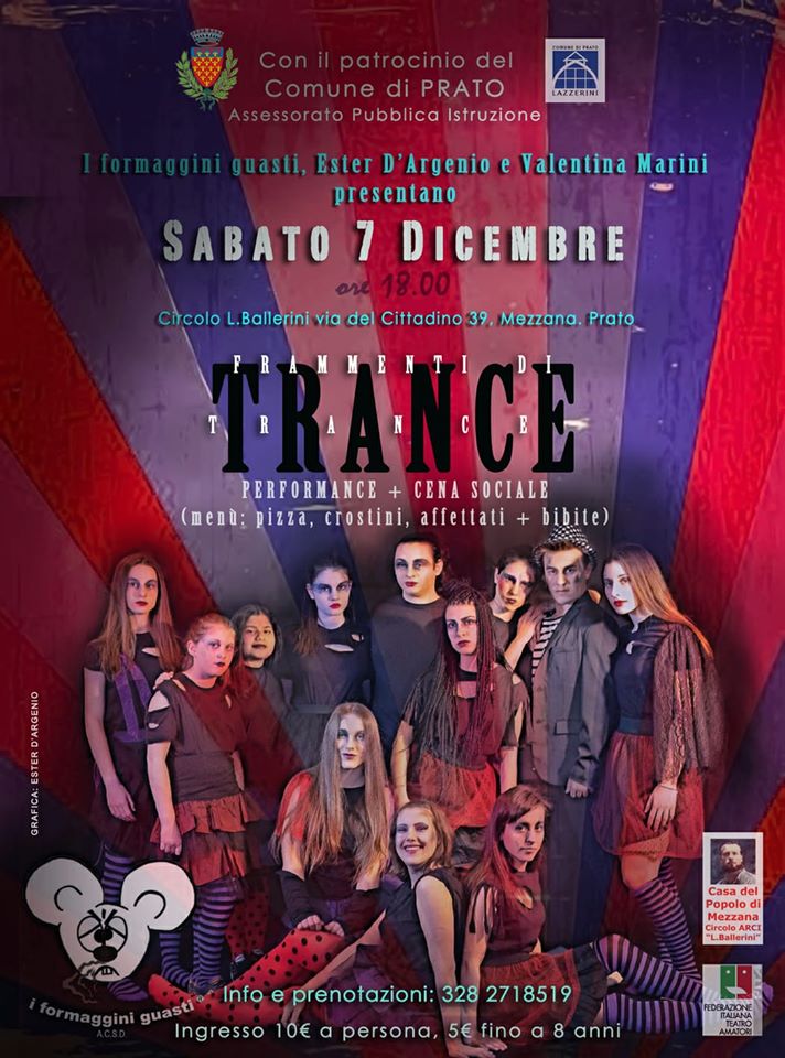 Sabato 7 dicembre, dalle ore 18.00, al Circolo Arci “L. Ballerini” a Mezzana (via del Cittadino 39, Prato), i Formaggini Guasti, Ester D’Argenio e Valentina Marini presentano “Frammenti di Trance”, performance e cena sociale. Per info e prenotazioni tel. 328 2718519