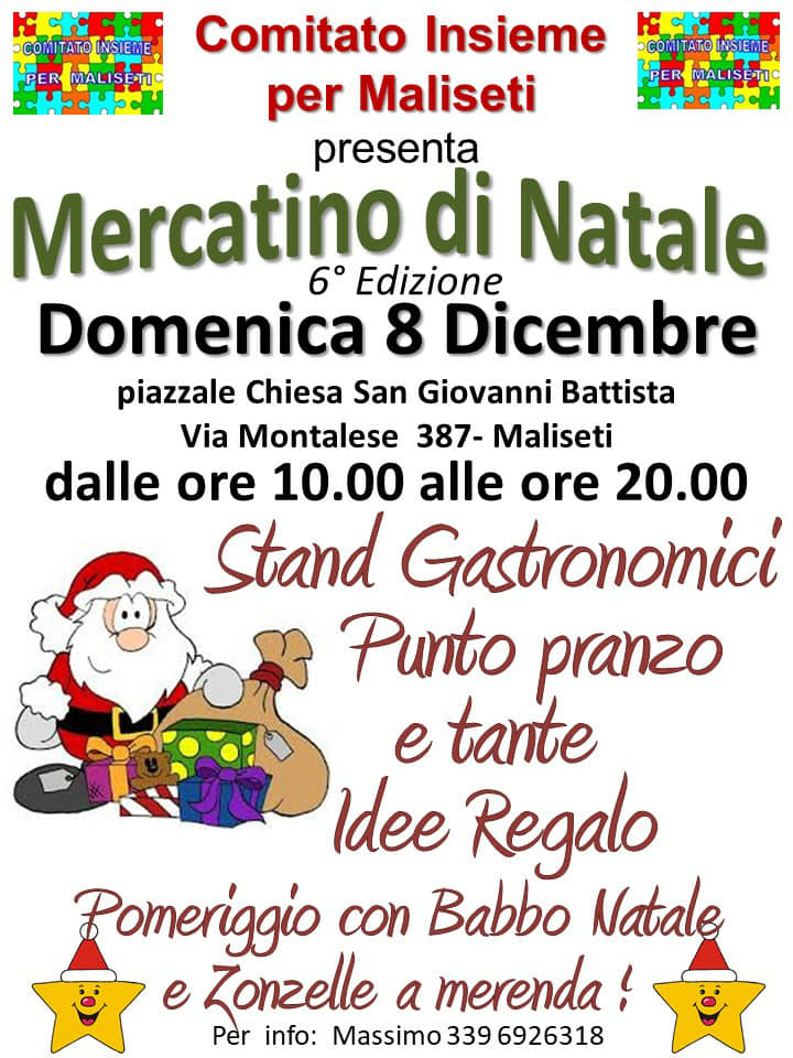 Domenica 8 dicembre, dalle 10.00 alle 20.00, 6a edizione del mercatino di Natale organizzato dal Comitato Insieme per Maliseti nel piazzale della chiesa di San Giovanni Battista (via Montalese 387, Prato)