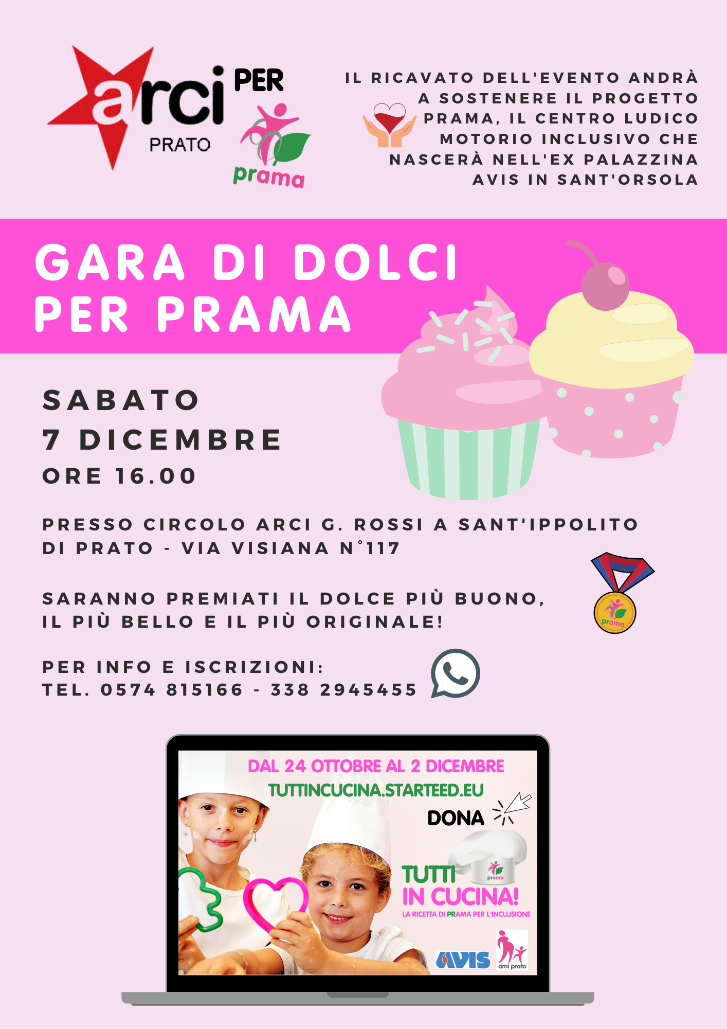 Sabato 7 dicembre alle ore 16.00 al Circolo Arci “G. Rossi” a Sant’Ippolito di Prato (via Visiana 117, Prato) Gara di dolci con premiazione del dolce più buono, del più bello e del più originale. Il ricavato andrà a sostenere il progetto PRAMA di Ami Prato, centro ludico motorio presso la palazzina ex Avis in via S. Orsola. Per info e iscrizioni tel. 0574 815166 – 338 2945455.