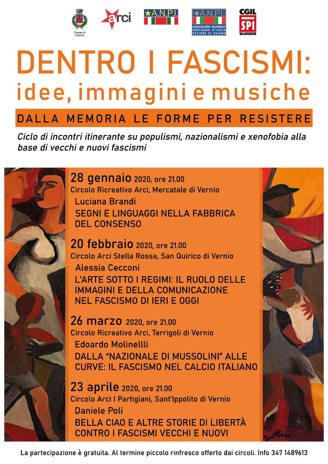 Dal 28 gennaio al 23 aprile nei Circoli Arci di Vernio “Dentro i fascismi: idee, immagini e musiche”, ciclo di incontri itinerante su populismi, nazionalismi e xenofobia alla base di vecchi e nuovi fascismi. L’iniziativa è realizzata in collaborazione con Anpi, SPI-CGIL e Comune di Vernio. Il programma completo….