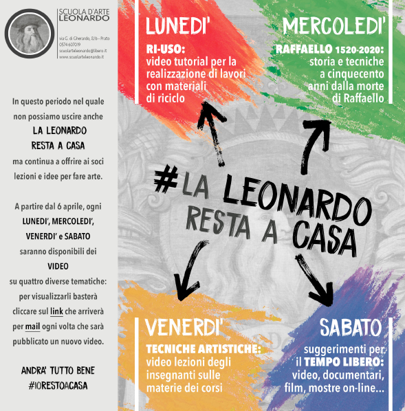 Da lunedì 6 aprile, la Scuola d’Arte Leonardo offre gratuitamente videolezioni e tutorial per fare arte a casa propria… Per informazioni e iscrizioni scuolarteleonardo@libero.it