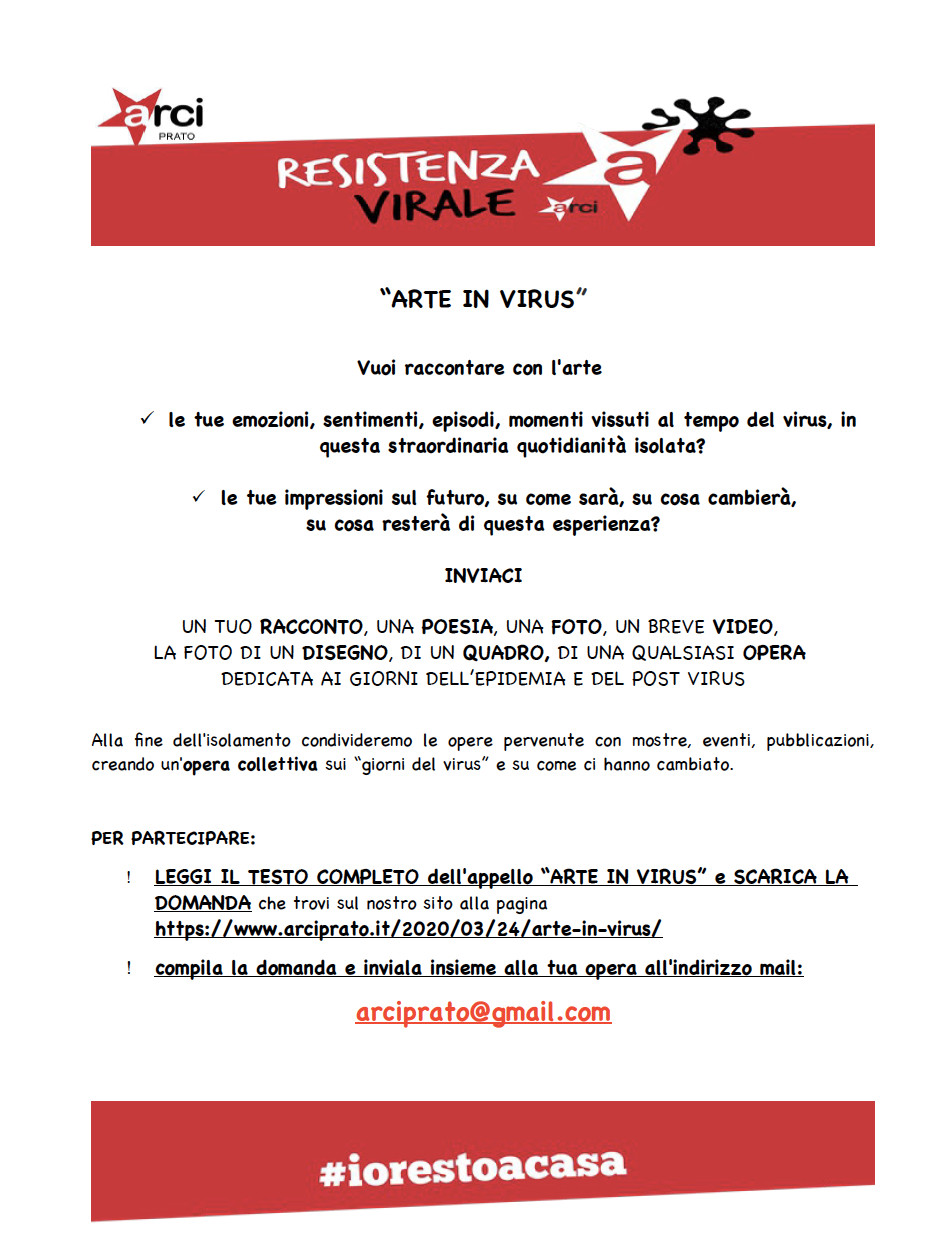 In questo periodo di isolamento, l’Arci di Prato lancia una proposta: mettere su carta, su foto, su tela…- E POI INVIARCI – emozioni, sentimenti, episodi, momenti che viviamo in questa straordinaria quotidianità isolata, ma anche impressioni sul futuro, su come sarà, su cosa cambierà, su cosa resterà di questa esperienza, al tempo stesso difficile e profonda. Quando i Circoli riapriranno e potremo insieme tornare a godere della socialità nelle nostre Case del Popolo, quando tutto sarà finito e potremo guardare insieme a quello che abbiamo vissuto con più consapevolezza e valutare se e come ne siamo usciti rafforzati, personalmente e collettivamente, condivideremo queste opere, organizzeremo mostre di foto e di quadri, letture, discussioni e anche una pubblicazione che resterà a testimonianza di questa incredibile esperienza e di quello che ci avrà lasciato.