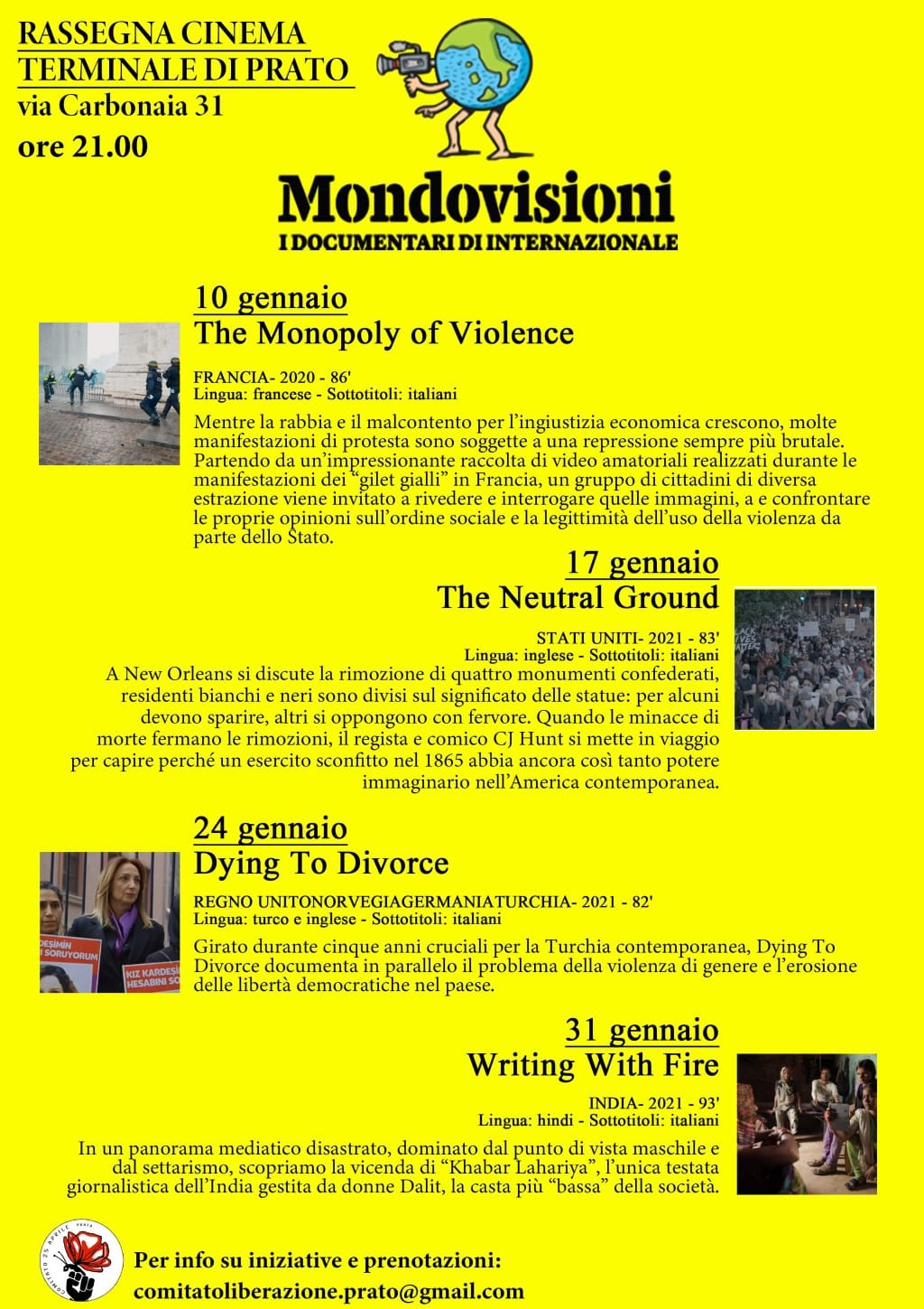 E’ in corso al Terminale Cinema (via Carbonaia 31, Prato) la rassegna “Mondovisioni. I documentari di Internazionale a Prato“, in collaborazione con il Comitato 25 Aprile Prato. Il programma completo delle proiezioni…