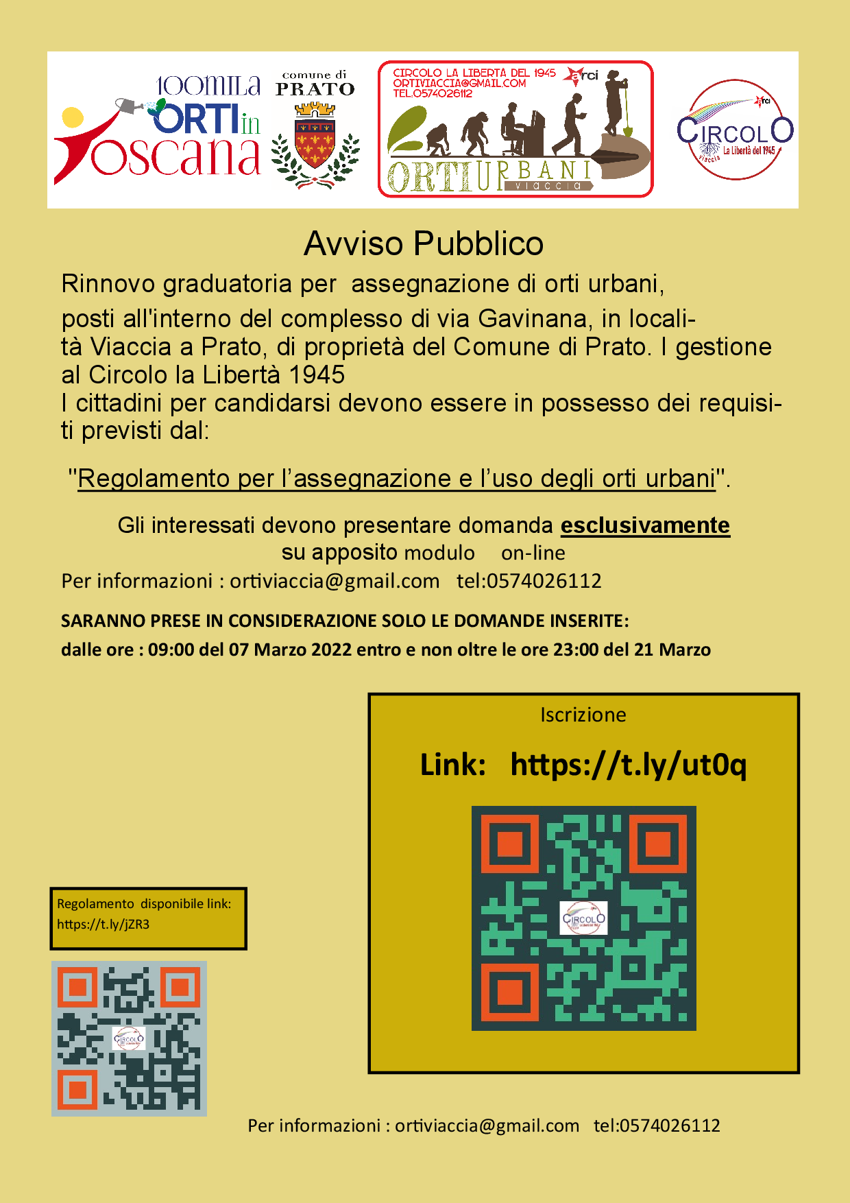 E’ aperto l’avviso pubblico per il rinnovo della graduatoria per l’assegnazione degli orti urbani posti all’interno del complesso di via Gavinana, in località Viaccia a Prato, di proprietà del Comune di Prato, in gestione al Circolo la Libertà 1945. Modulo per partecipare alla pagina https://t.ly/ut0q. Per consultare il regolamento degli orti urbani https://t.ly/ut0q