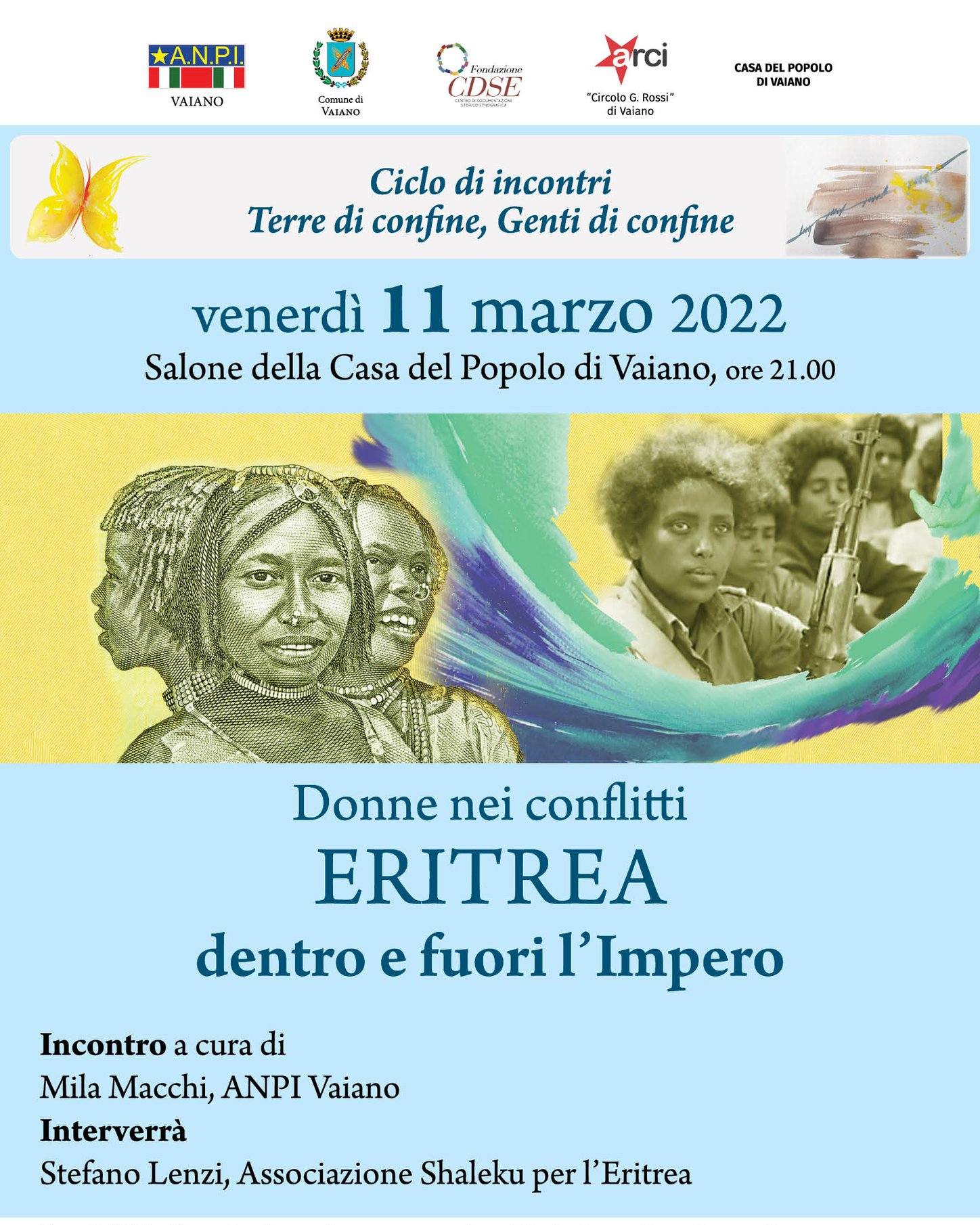 Venerdì 11 marzo alle ore 21.00 alla Casa del Popolo di Vaiano, per il ciclo “Terre di confine, Genti di confine”, si terrà un incontro dal titolo “Donne nei conflitti: Eritrea, dentro e fuori l’impero. Interverranno Mila Macchi (Anpi Vaiano) e Stefano Lenzi (Associazione Shaleku). L’iniziativa è organizzata da ANPI, CDSE, Casa del Popolo di Vaiano, con il patrocinio del Comune di Vaiano.