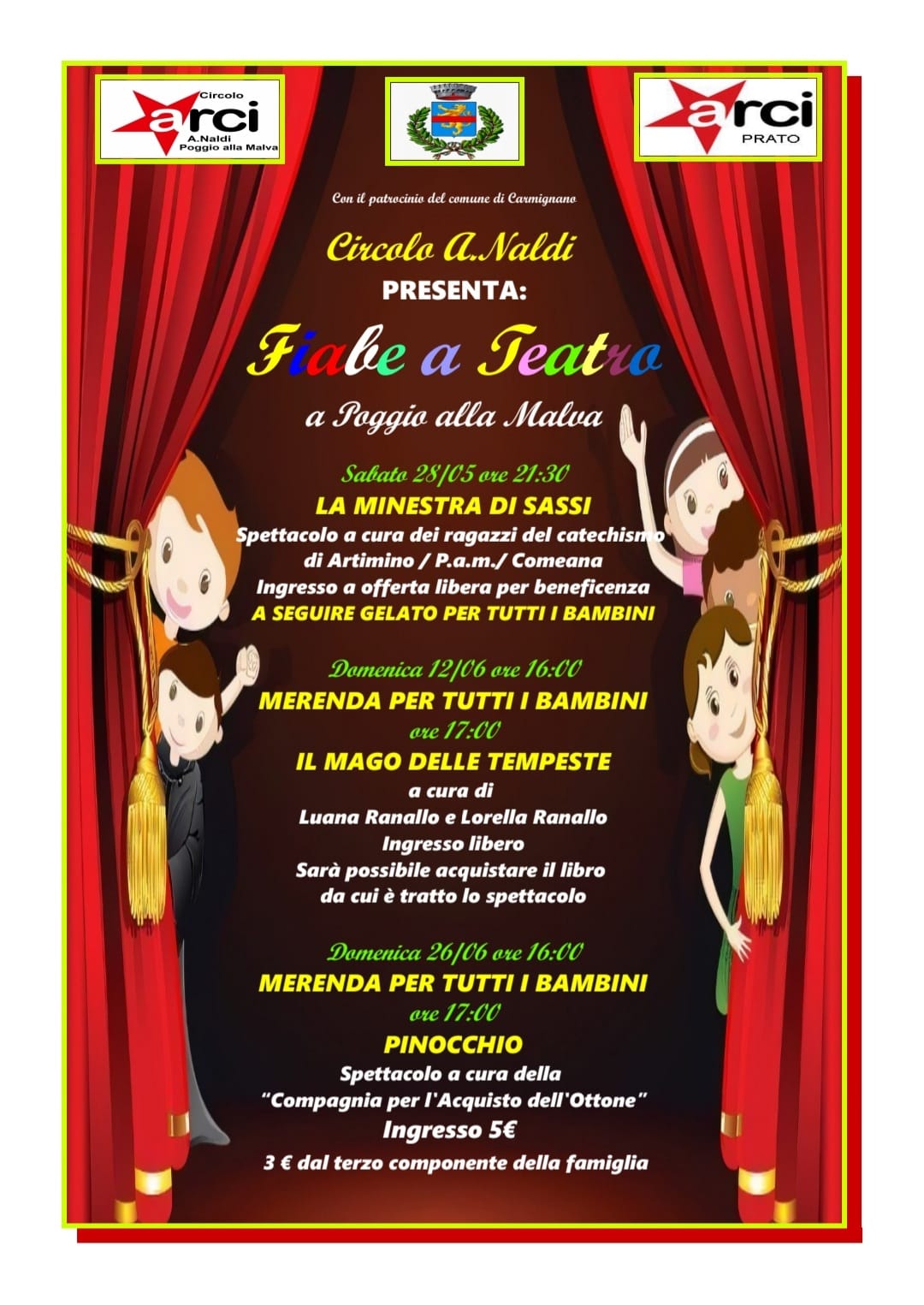 Fino a domenica 26 giugno, appuntamenti per i bambini e le famiglie al Circolo Arci “Ariodante Naldi” a Poggio alla Malva (Carmignano). In programma sabato 28 “La minestra di sassi”, spettacolo a cura dei ragazzi del catechismo; domenica 12 giugno “Il mago delle tempeste”, presentazione-spettacolo del libro di Luana e Lorella Ranallo; domenica 26 giugno “Pinocchio” spettacolo della compagnia Ottone Teatro.