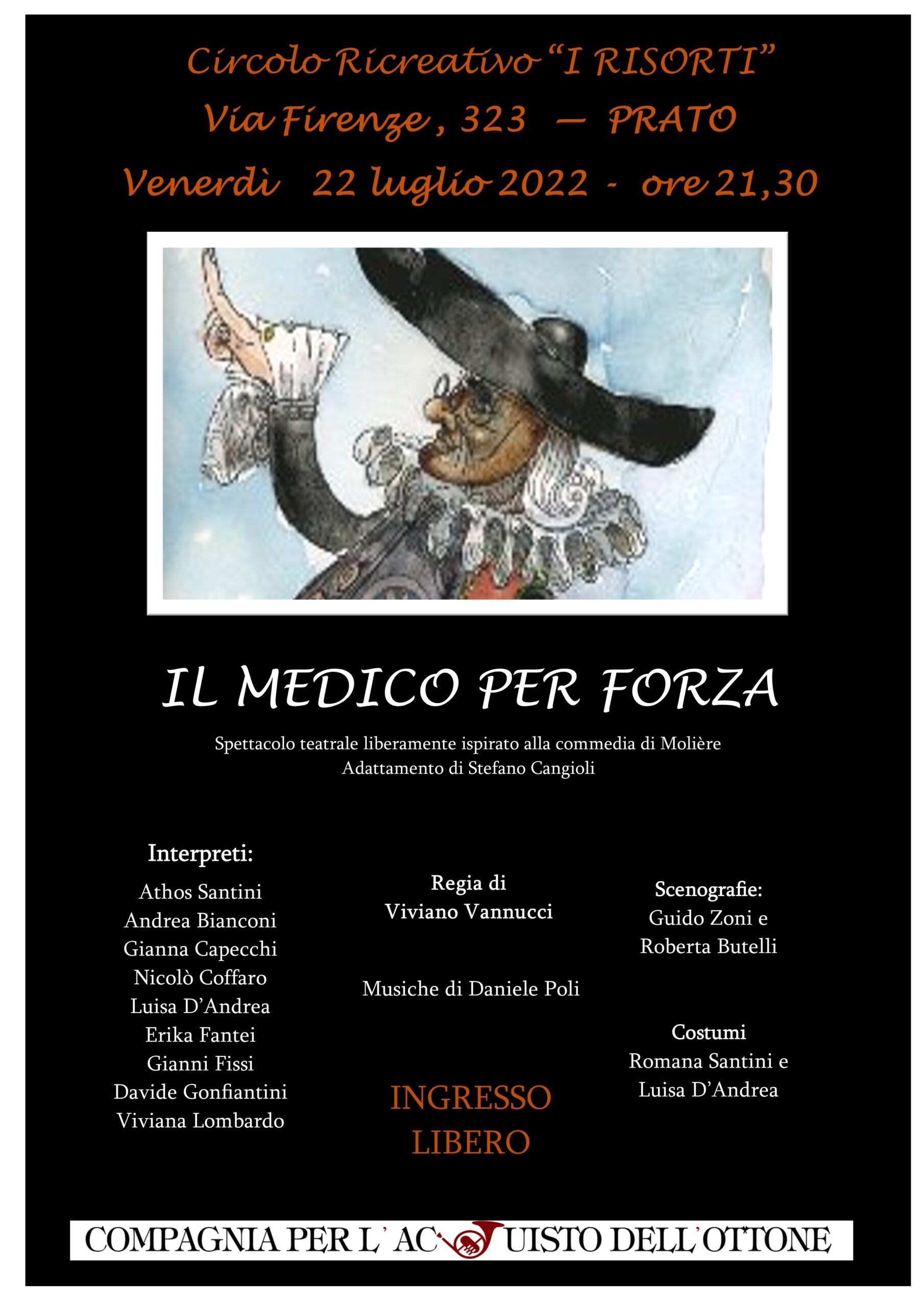 Venerdì 22 luglio, al Circolo “I Risorti” a La Querce (via Firenze 323, Prato), è in programma lo spettacolo della Compagnia Ottone Teatro liberamente ispirato alla commedia di Molière, adattamento di Stefano Cangioli, regia di Viviano Vannucci. Ingresso libero.