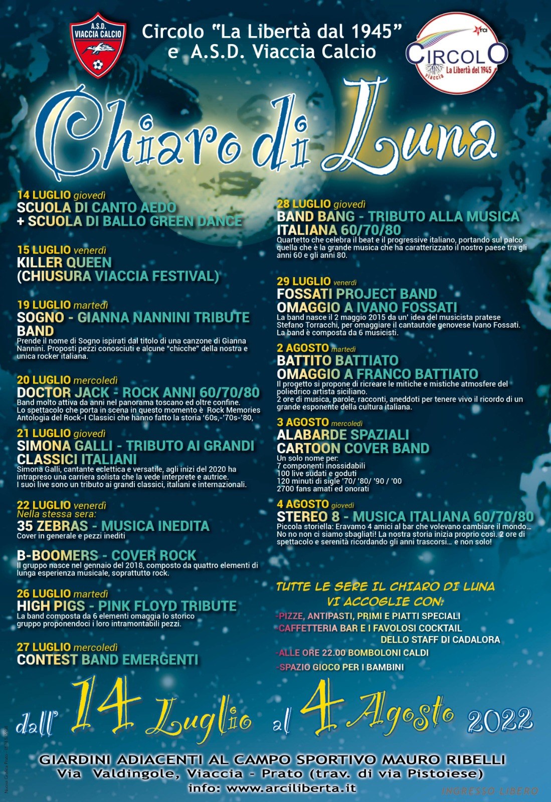 Torna dal 14 luglio al Campo sportivo di Viaccia, il “Chiaro di luna”, la manifestazione estiva organizzata dal Circolo “La Libertà del 1945” in collaborazione con A.S.D. Viaccia Calcio. Fino al 4 agosto, musica dal vivo e gastronomia. Il programma completo…
