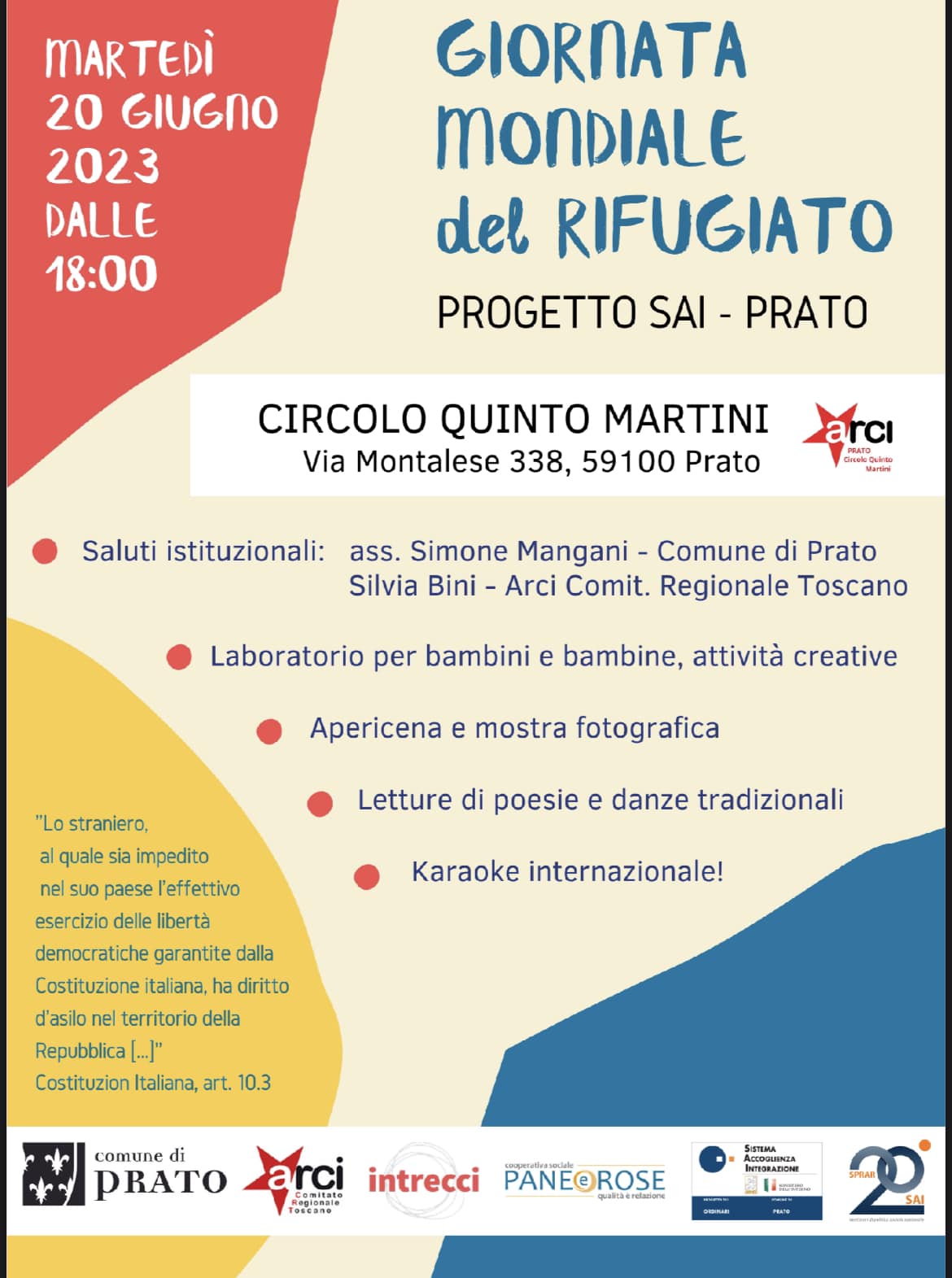 In occasione della Giornata Mondiale del Rifugiato, martedì 20 giugno, dalle 18:00, al Circolo Arci “Quinto Martini” a Maliseti è in programma un evento a cura del progetto SAI – Prato. In programma, dopo i saluti istituzionali dell’Assessore Simone Mangani del Comune di Prato e di Silvia Bini, responsabile immigrazione di Arci Toscana, un laboratorio creativo per bambini e bambine, apericena e mostra fotografica, lettura di poesie e danze tradizionali e per finire un karaoke internazionale.
