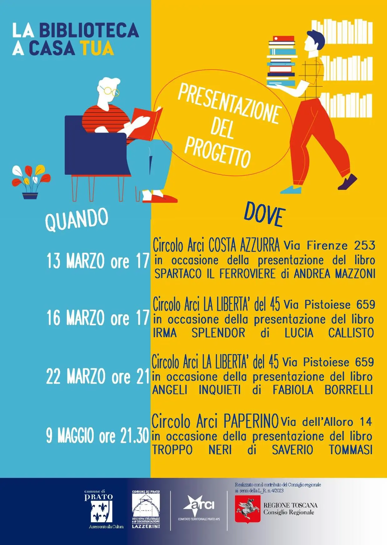 ATTENZIONE: L’APPUNTAMENTO DI GIOVEDI’ 9 MAGGIO AL CIRCOLO DI PAPERINO E’ RIMANDATO A MERCOLEDI’ 22 MAGGIO ALLE ORE 21:30. Da mercoledì 13 marzo un ciclo di appuntamenti nei circoli Arci che hanno aderito al progetto “La biblioteca a casa tua” per promuovere la lettura e informare sul servizio di consegna e ritiro del materiale della biblioteca a domicilio e presso i Circoli. Il primo appuntamento, mercoledì 13 marzo è al Circolo “Costa Azzurra” a La Macine, alle 17:00, con la presentazione del libro “Spartaco il ferroviere” di Andrea Mazzoni, alla presenza dell’autore. Il calendario completo…