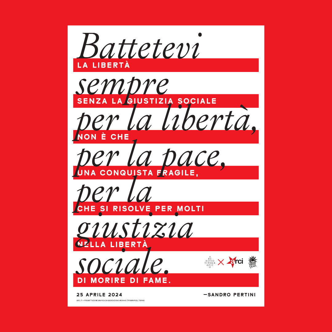 L’Arci celebra il 79o anniversario della Liberazione dal nazifascismo con una frase di Sandro Pertini, quanto mai attuale, che mette in connessione la lotta per la Liberazione con l’impegno a costruire un futuro di pace e giustizia sociale. Un appello all’azione e alla mobilitazione che riteniamo oggi fondamentale per contrastare ogni tentativo di repressione e censura del dissenso messo in atto dall’attuale Governo, per cambiare un mondo sempre più fragile e disuguale, attraversato da conflitti, muri e frontiere che uccidono.