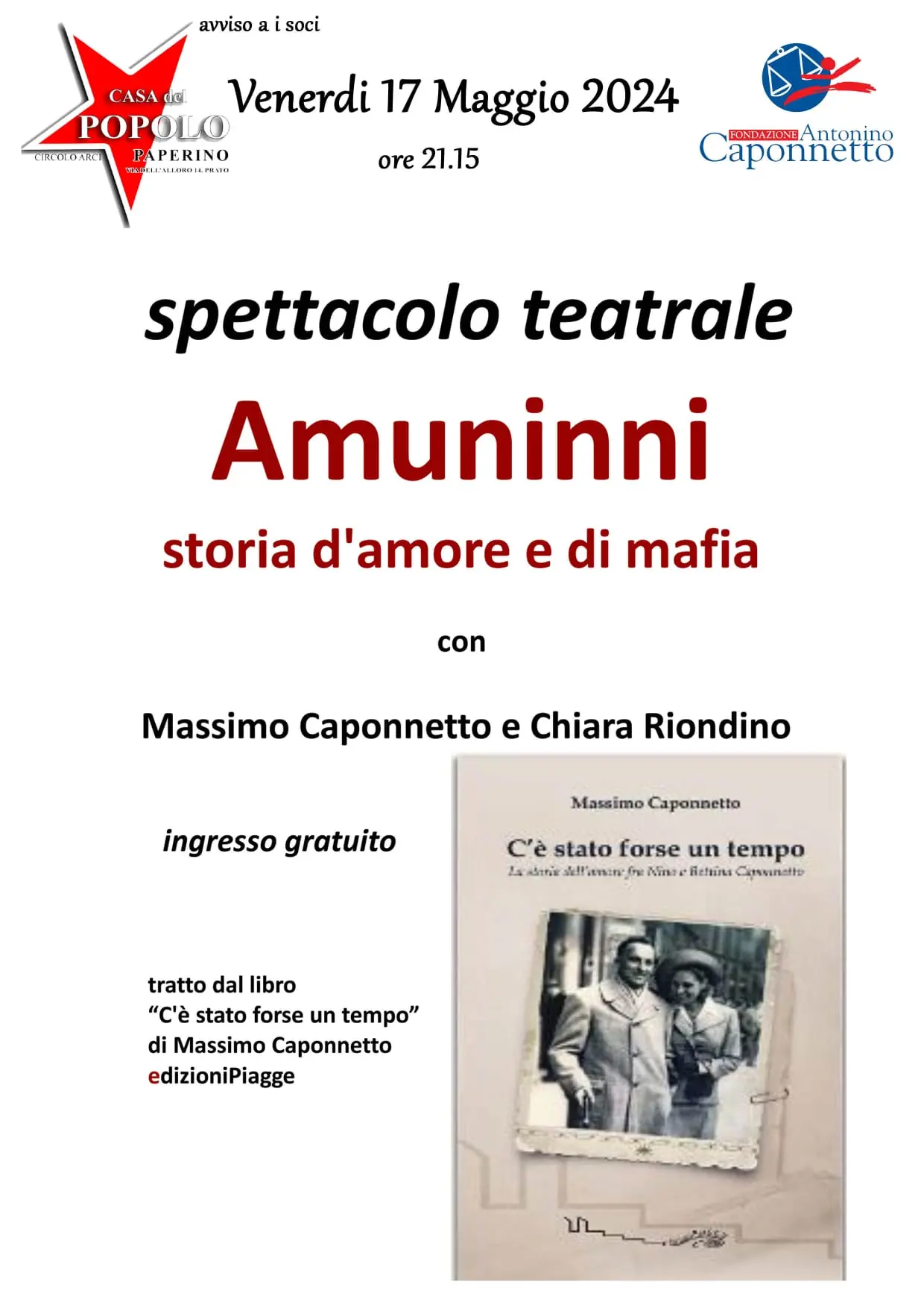 Venerdì 17 maggio, alle 21:15, al Circolo Arci di Paperino, va in scena “Amuninni. Storia d’amore e di mafia”, spettacolo teatrale di e con Massimo Caponnetto e Chiara Riondino, tratto dal libro “C’è stato forse un tempo” di Massimo Caponnetto. Igresso libero