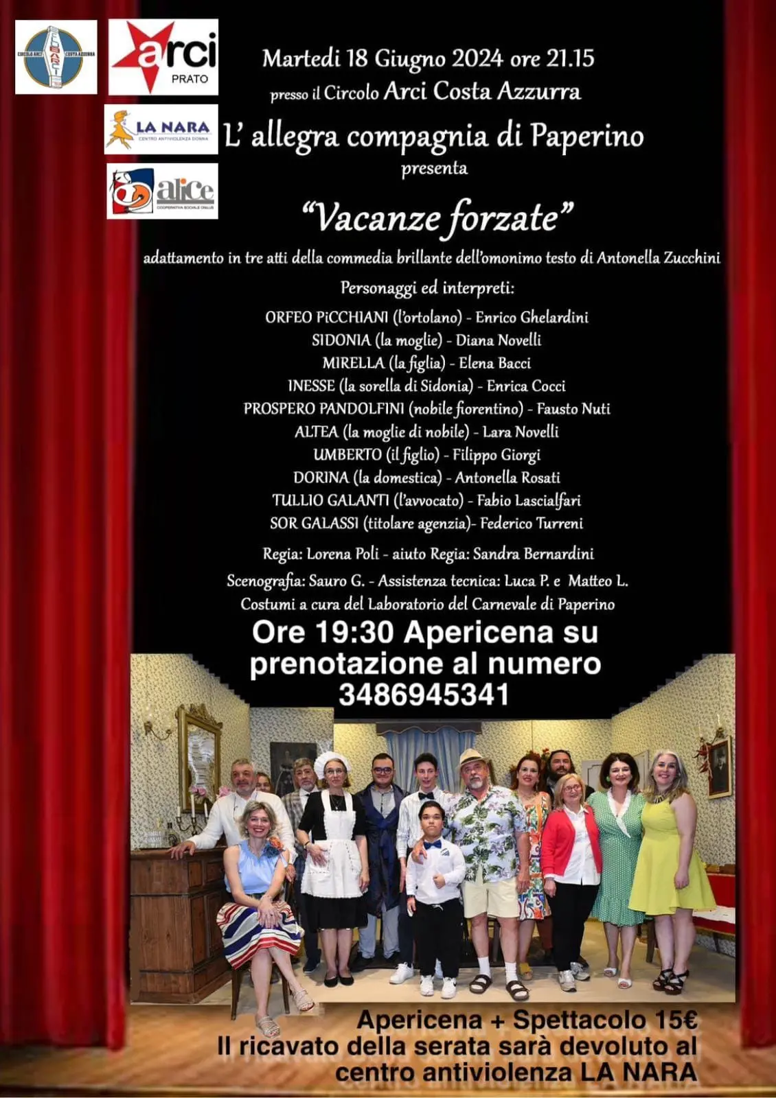 I prossimi appuntamenti al Circolo Arci “Costa Azzurra” a La Macine sono due serate a sostegno del Centro antiviolenza La Nara a cui sarà devoluto il ricavato: martedì 18 giugno L’allegra Compagnia di Paperino presenta la commedia brillante “Vacanze forzate“, adattamento in tre atti dell’omonimo testo di antonella Zucchini, regia Lorena Poli; giovedì 20 giugno “Fiesta! Buon compleanno Raffa“, serata dedicata a Raffaella Carrà. Prima di entrambi gli spettacoli ci sarà un’apericena al circolo, per chi vuole. Il ricavato sarà devoluto a La Nara.