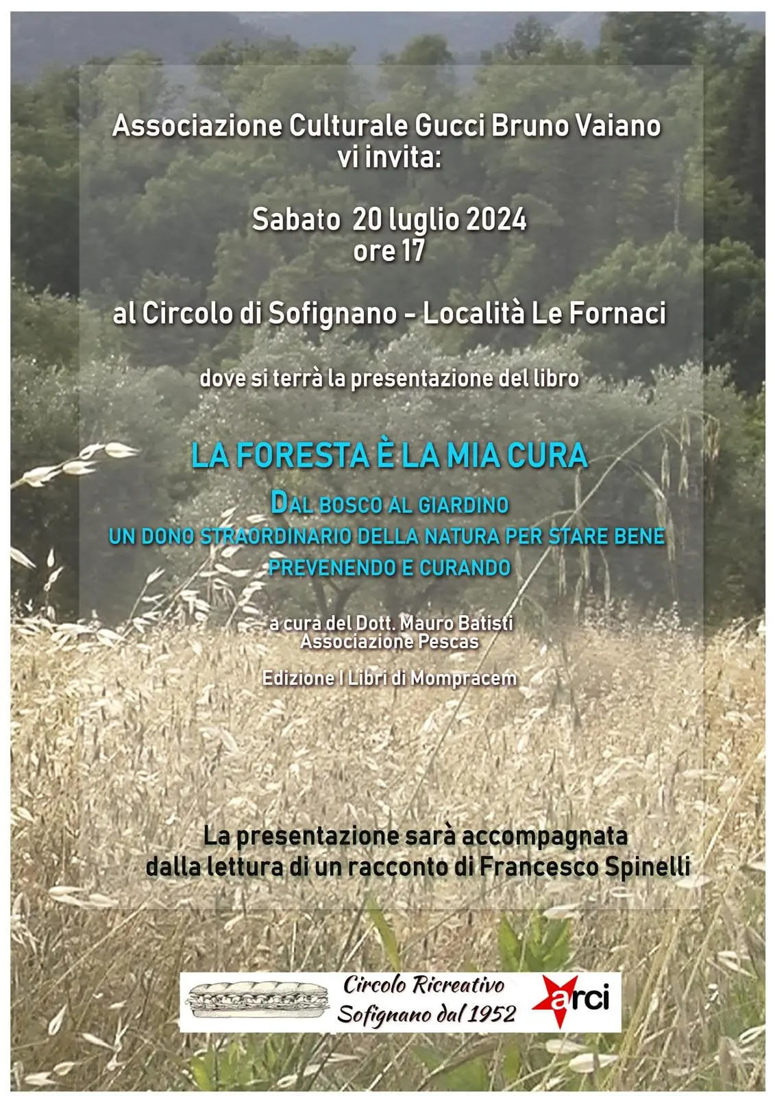 Sabato 20 luglio, alle 17:00, al Circolo di Sofignano, incontro con Mauro Batisti e presentazione del suo libro “La foresta è la mia cura. Dal bosco al giardino, un dono straordinario della natura per stare bene prevenendo e curando”. In collaborazione con l’associazione culturale Gucci Bruno Vaiano