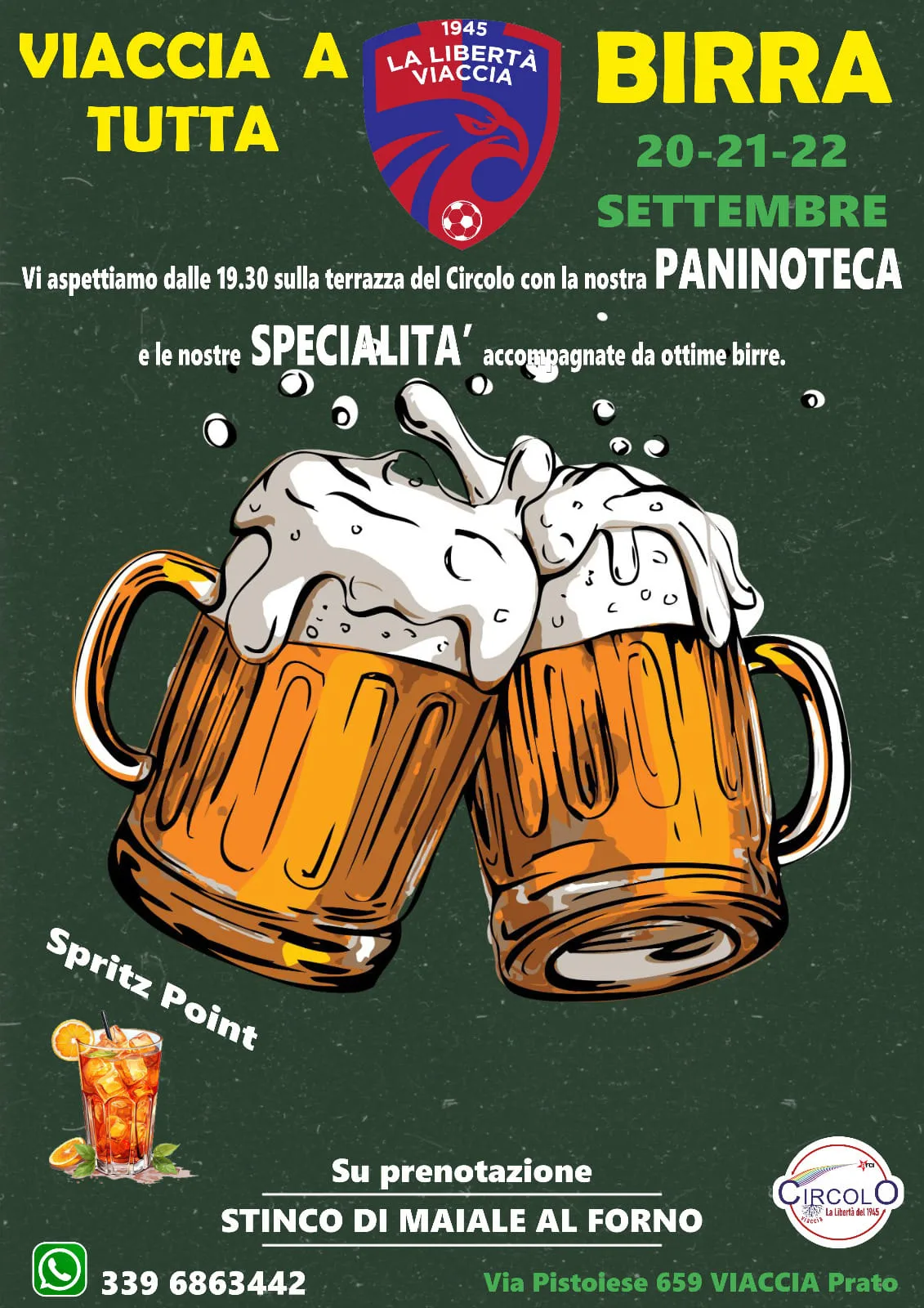 Da venerdì 20 a domenica 22 settembre al Circolo Arci “La Libertà del 1945” a Viaccia torna la Festa della Birra con paninoteca e altre specialità gastronomiche.