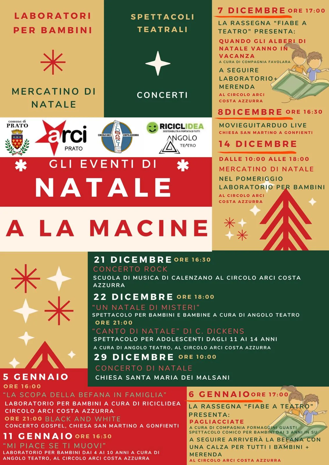 Dal 7 dicembre al 6 gennaio, la frazione della Macine si anima per le Feste: spettacoli e laboratori per bambini e ragazzi, concerti, mercatini. Con il patrocinio e il contributo del Comune di Prato. Il programma…