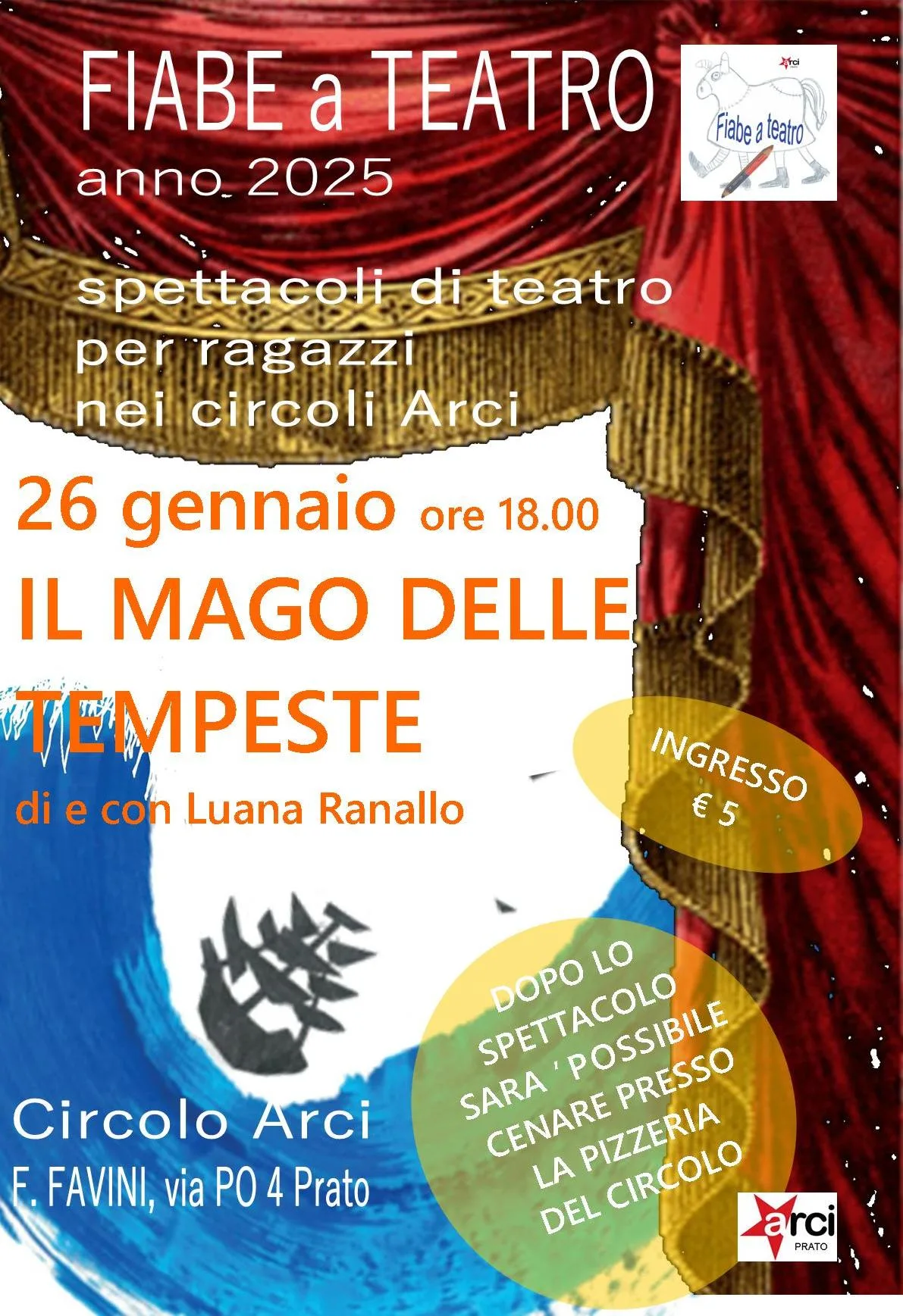 Domenica 26 gennaio, alle 18:00, al Circolo Arci “F. Favini” a Chiesanuova (Via Po 4, Prato), “Fiabe a Teatro”, rassegna di teatro per bambini e famiglie, presenta lo spettacolo “Il Mago delle Tempeste” di e con Luana Ranallo, una storia di magia, mostri e spiriti su un’isola incantata, sotto il potere di un grande mago. Ingresso 5 €. Età consigliata 5-12 anni. E dopo lo spettacolo, per chi vuole, sarà aperta la pizzeria del Circolo.
