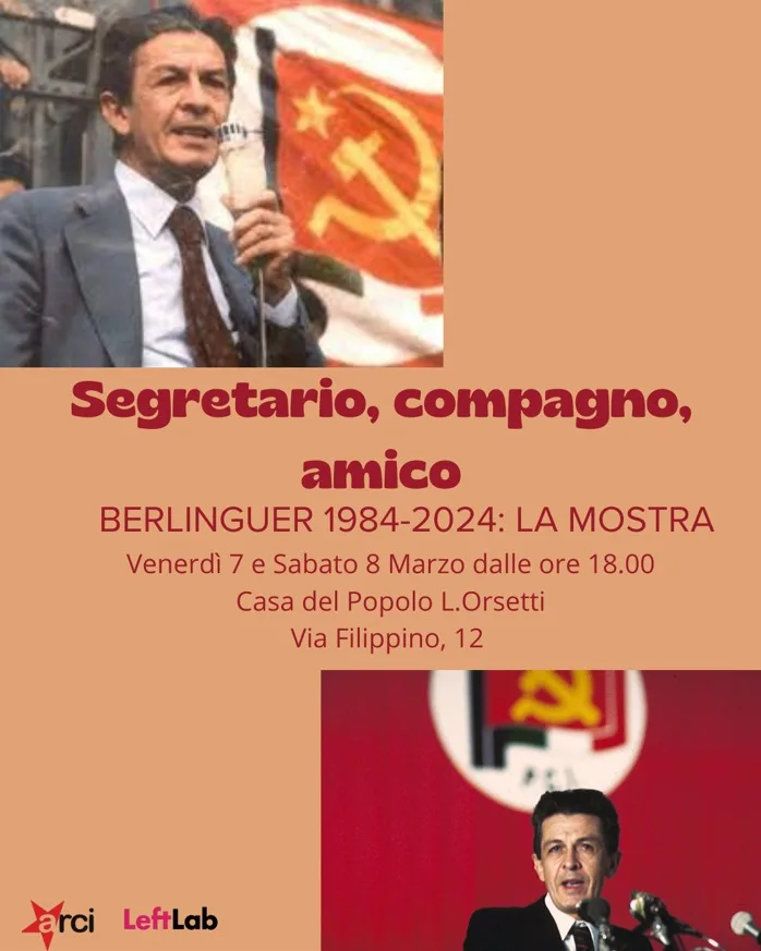 Venerdì 7 e sabato 8 marzo la mostra “Berlinguer 1984-2024”, ideata e realizzata dai volontari del Circolo “A. Naldi” di Poggio alla Malva per omaggiare la memoria dello storico Segretario del PCI a 40 anni dalla morte, approda nel centro di Prato, alla Casa del Popolo “Lorenzo Orsetti” (Via Filippino 12). sabato pomeriggio alle 18:30 i saluti istituzionali, con la partecipazione di Ilaria Bugetti, Sindaca di Prato, Diego Blasi, Assessore al Centro Storico, Alessandro Affortunati, saggista, Ilaria Testa, Presidente Arci Prato, Edoardo Carli, consigliere comunale. Ingresso libero e gratuito.
