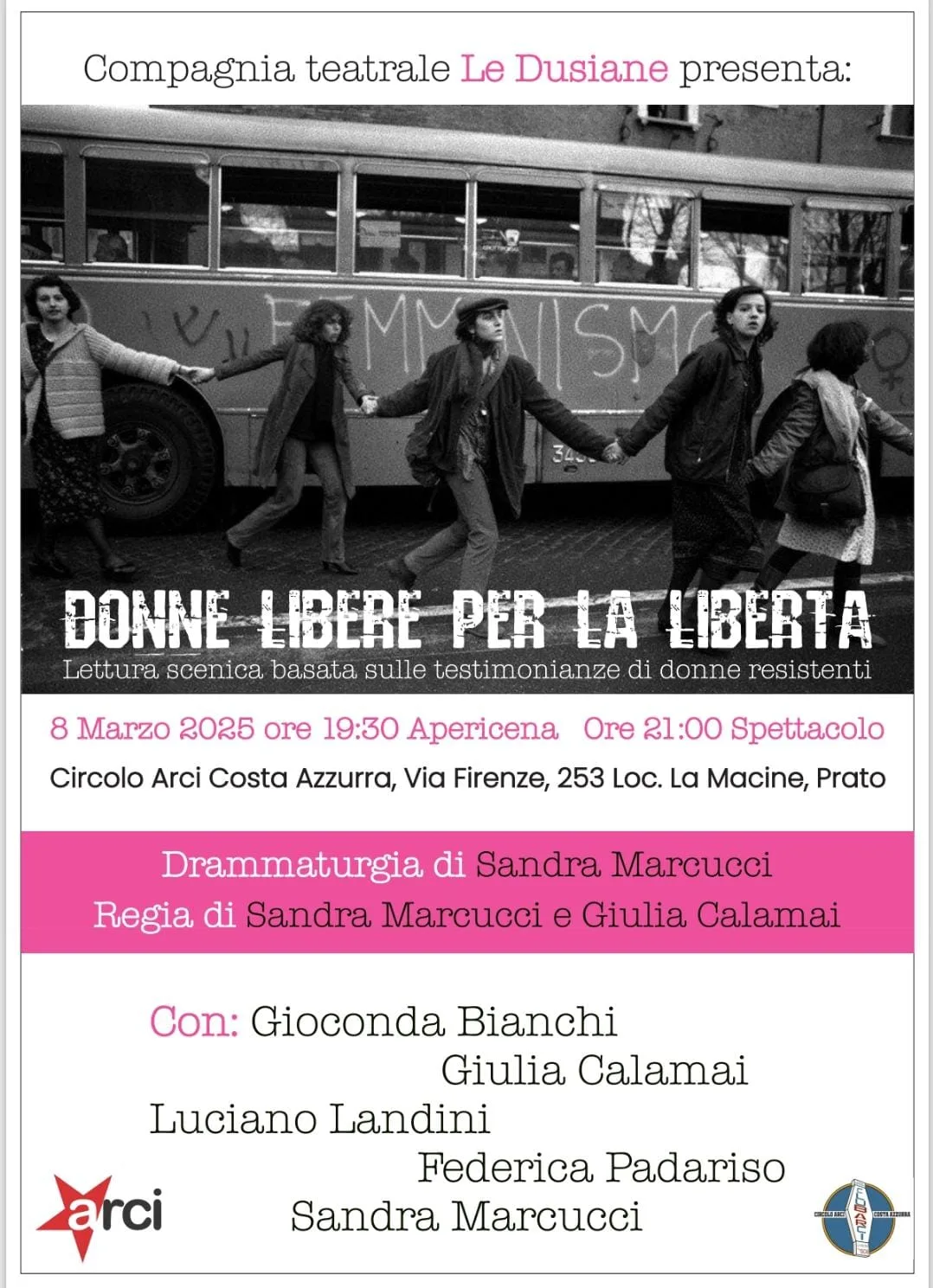 Sabato 8 marzo, alle 21:00, al Circolo Arci “Costa Azzurra” a La Macine, la compagnia teatrale “Le Dusiane” presenta “Donne libera per la libertà” lettura scenica basata sulle testimonianze di donne resistenti, drammaturgia di Sandra Marcucci, regia di Sandra Marcucci e Giulia Calamai, con Gioconda Bianchi, Giulia Calamai, Luciano Landini, Federica Paradiso, Sandra Marcucci. Prima dello spettacolo, dalle 19:30, sarà possibile consumare un’apericena al Circolo.