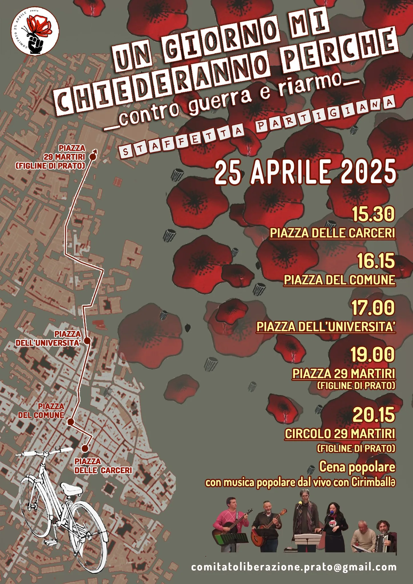 Venerdì 25 aprile è in programma a Prato l’edizione 205 della “Staffetta partigiana” organizzata dal Comitato 25 aprile che quest’anno ha come titolo “Un giorno mi chiederenno perché. Contro guerra e riarmo”. Il percorso partirà da piazza delle Carceri alle 15:30 per terminare a Figline dove si terrà, al Circolo Arci 29 Martiri, la cena popolare con musica dal vivo del gruppo I Cirimballi. Per info comitatoliberazione.prato@gmail.com