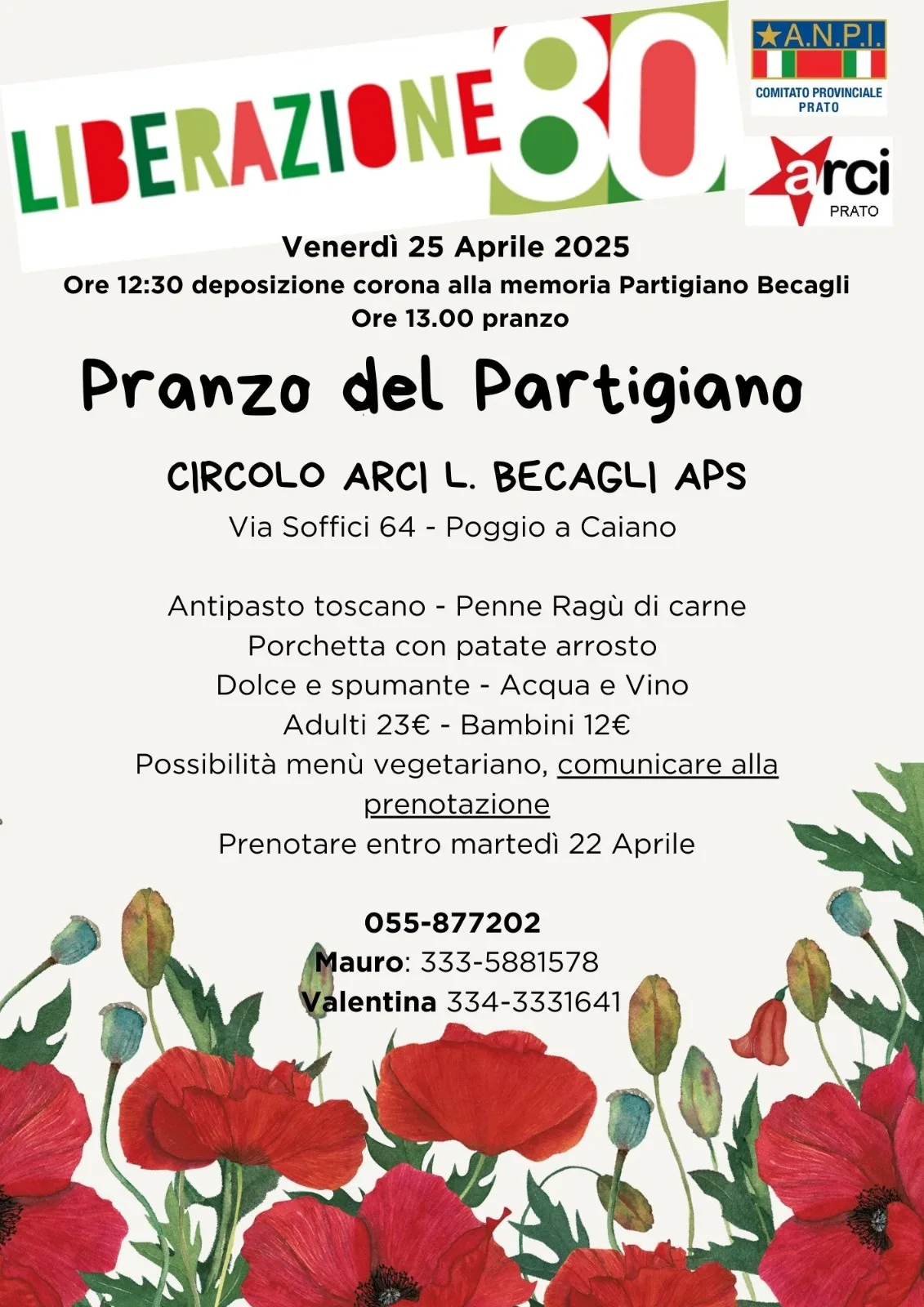 Nell’80° anniversario della Liberazione dal nazifascismo, venerdì 25 aprile 2025, il tradizionale Pranzo del Partigiano organizzato da Anpi e Arci, si terrà al Circolo “Luigi Becagli” a Poggio a Caiano (Via Soffici, 64). Prenotazione obbligatoria entro martedì 22 aprile ai numeri 3335881578 o 3343331641