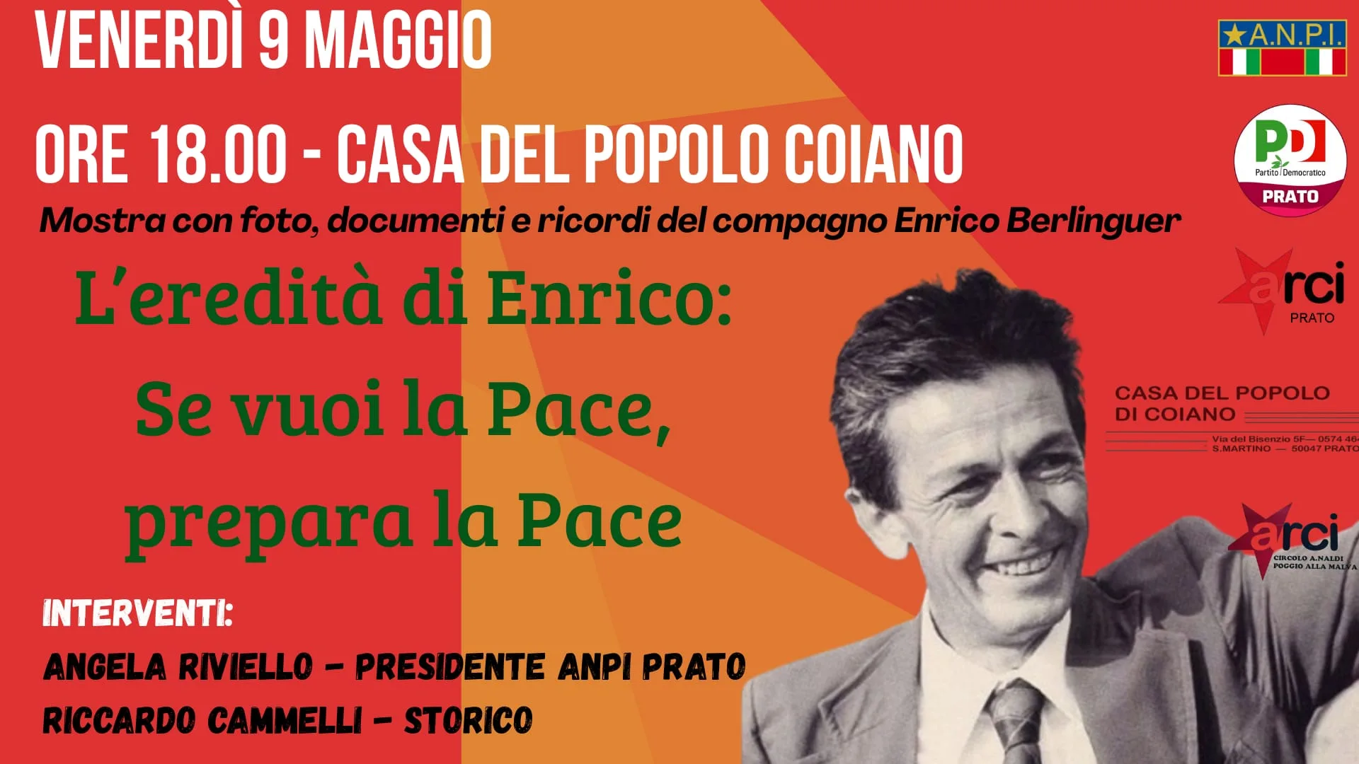 Venerdì 9 maggio alle 18:00 alla Casa del Popolo di Coiano, inaugurazione della mostra dedicata a Enrico Berlinguer e allestita dai volontari del Circolo “A. Naldi” di Poggio alla Malva. In occasione dell’apertura sono in programma interventi di Angela Riviello, Presidente Anpi Prato, e Riccardo Cammelli, storico.